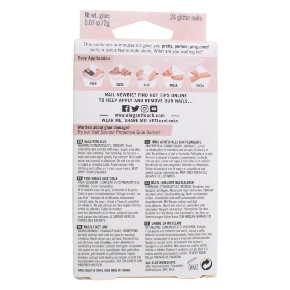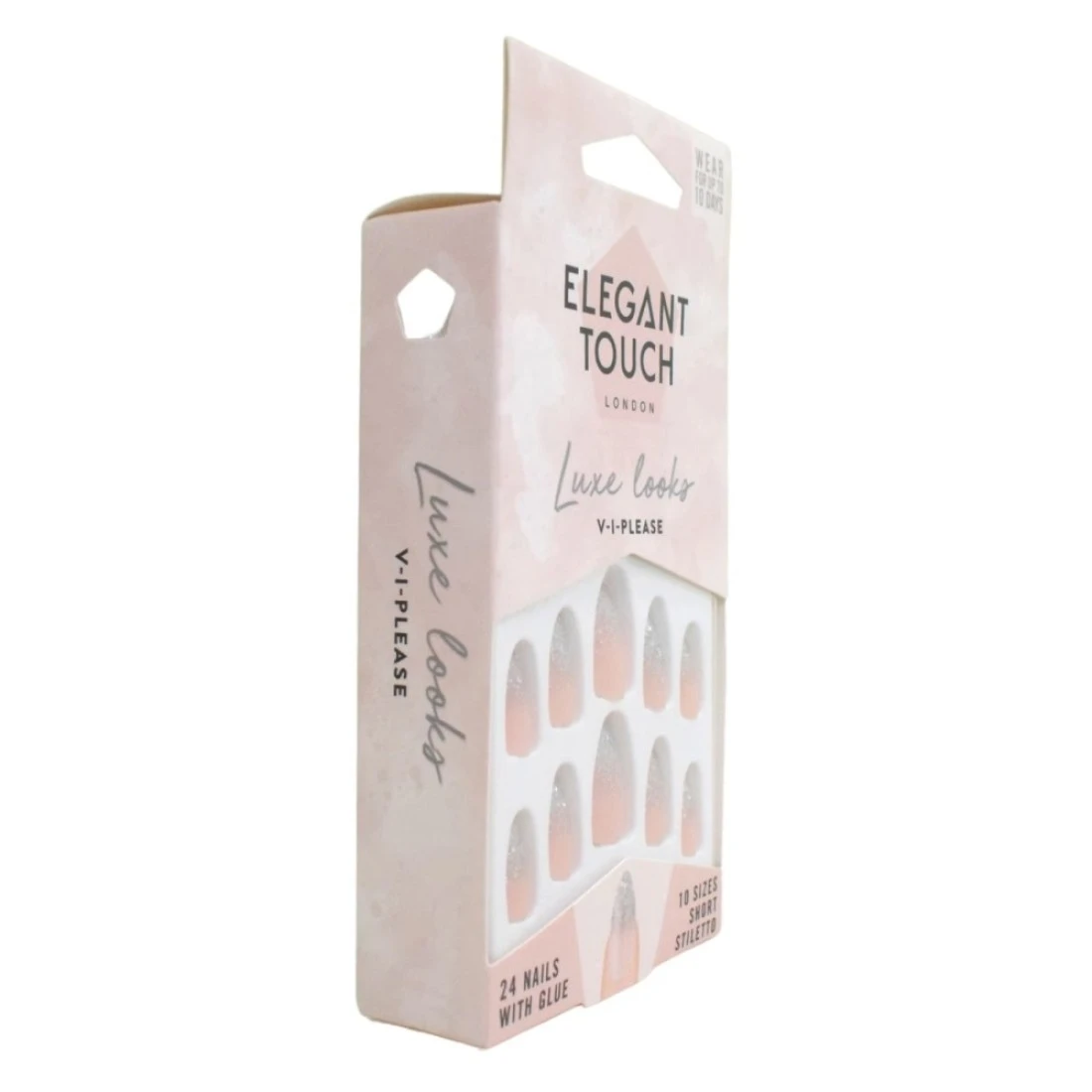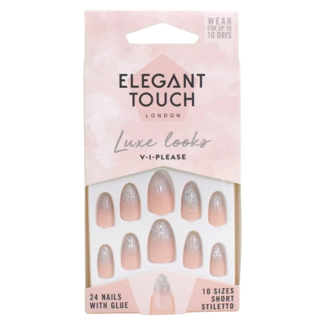 Elegant Touch Luxe Looks False Nails With Glue V-I-Please Pack of 24 is a stunning set of false nails that will give your hands an instant glamorous makeover. These nails are designed to be long-lasting and durable so you can enjoy beautiful salon-quality nails for longer. With a beautiful V-I-Please design these nails are perfect for any occasion whether it's a special event or just a night out with friends. The set includes 24 nails and glue making it easy to apply and remove. Transform your nails with these Elegant Touch Luxe Looks False Nails and get ready to turn heads wherever you go.