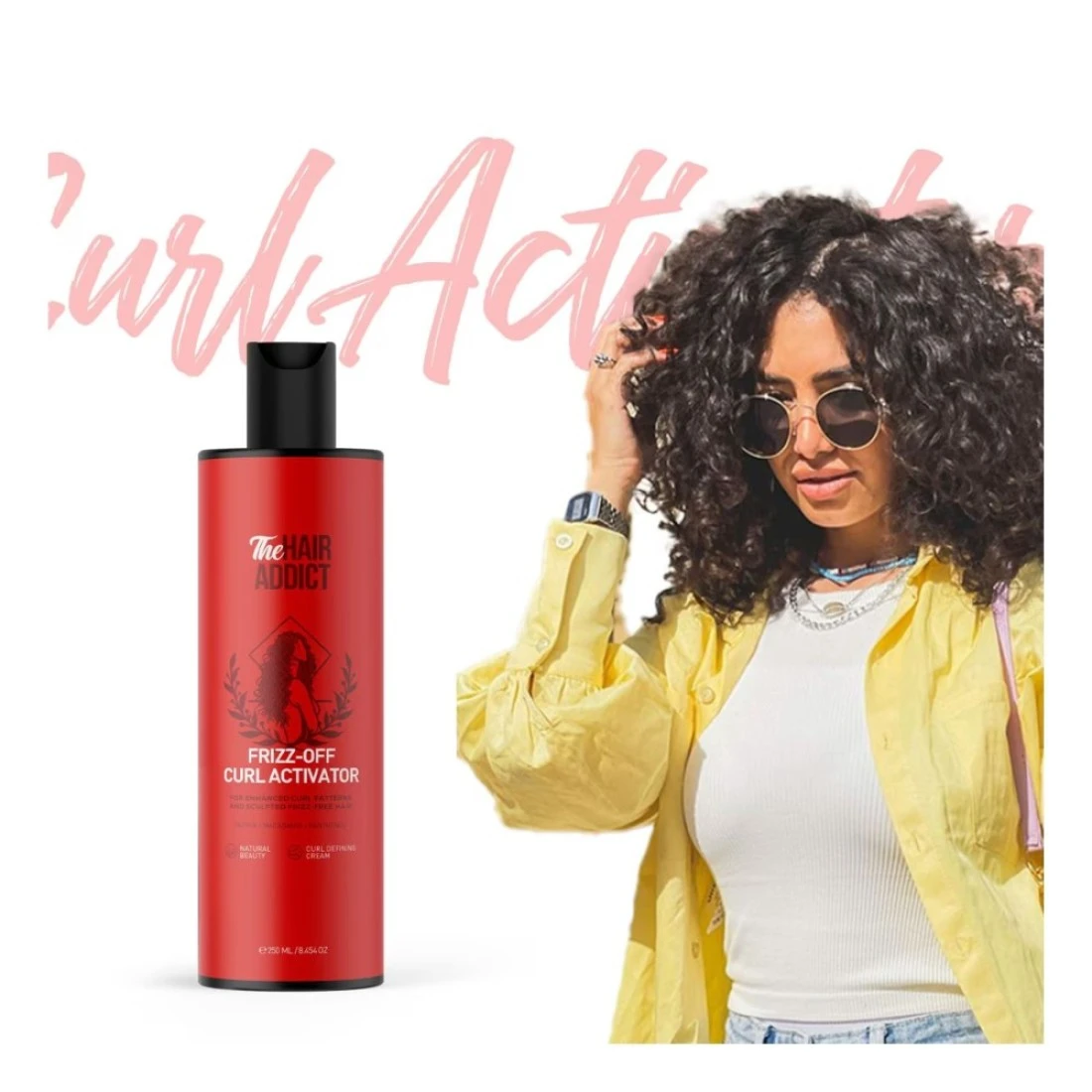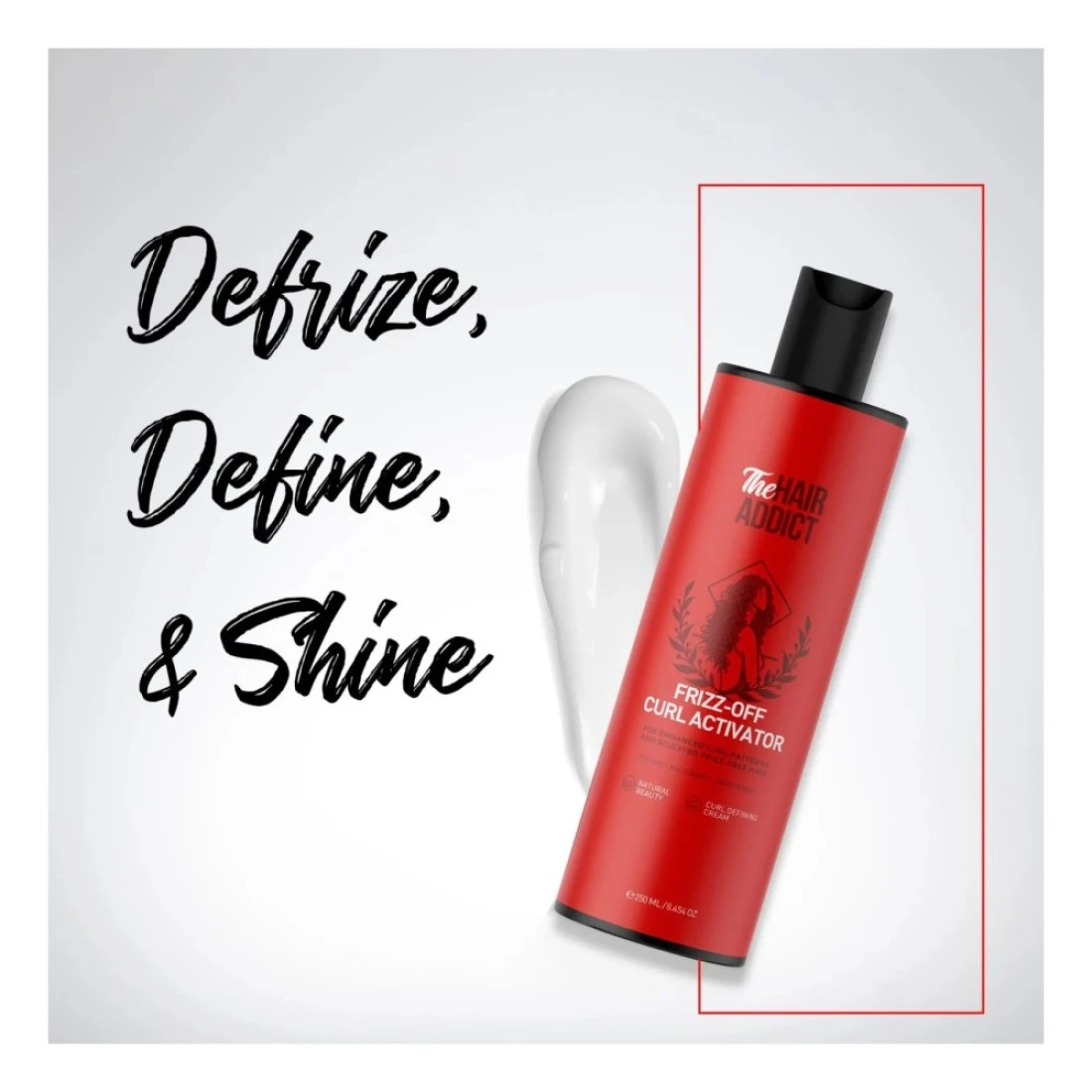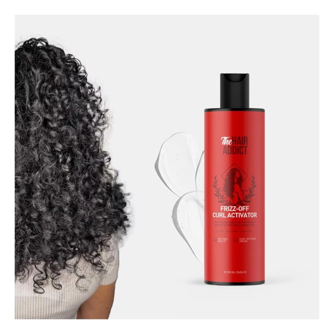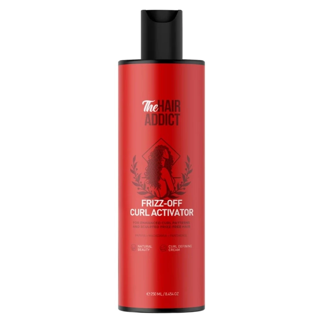 The Hair Addict Frizz-Off Curl Activator is a 250ml hair product designed to help control frizz and define curls. It provides moisture and nourishment to the hair, leaving it smooth and manageable.