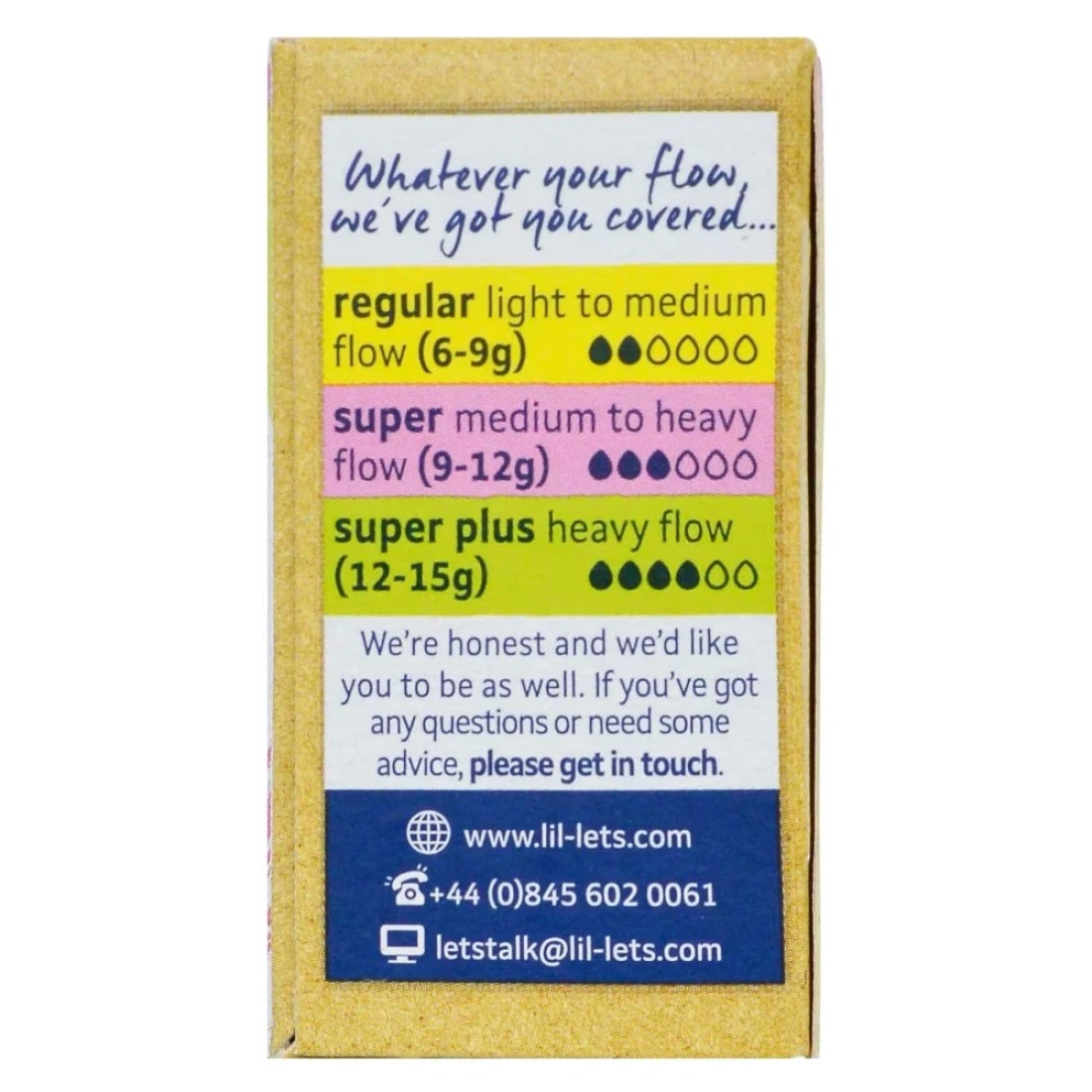 - Lil-Lets Organic non-applicator super tampons are suitable for a medium to heavy flow or your medium to heavy days