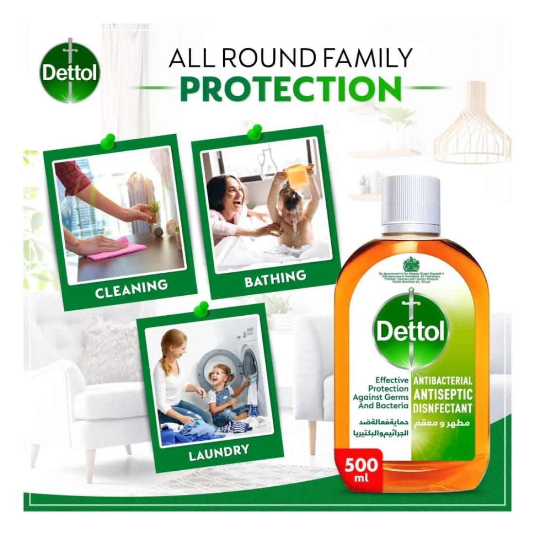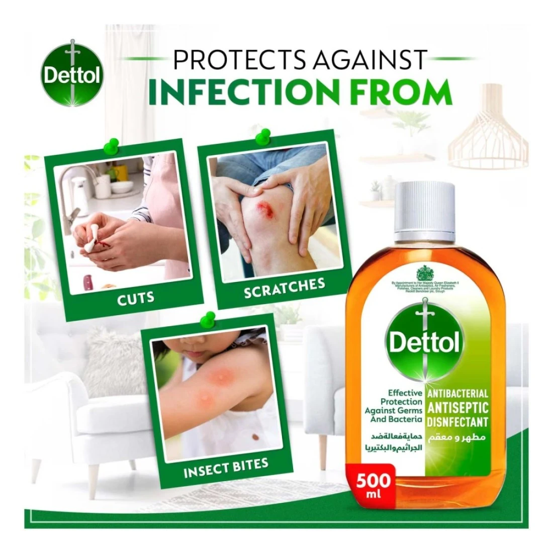 - This Dettol liquid protects against infection from cuts, scratches, and insect bites and can also be used as a household disinfectant on surfaces or in the laundry