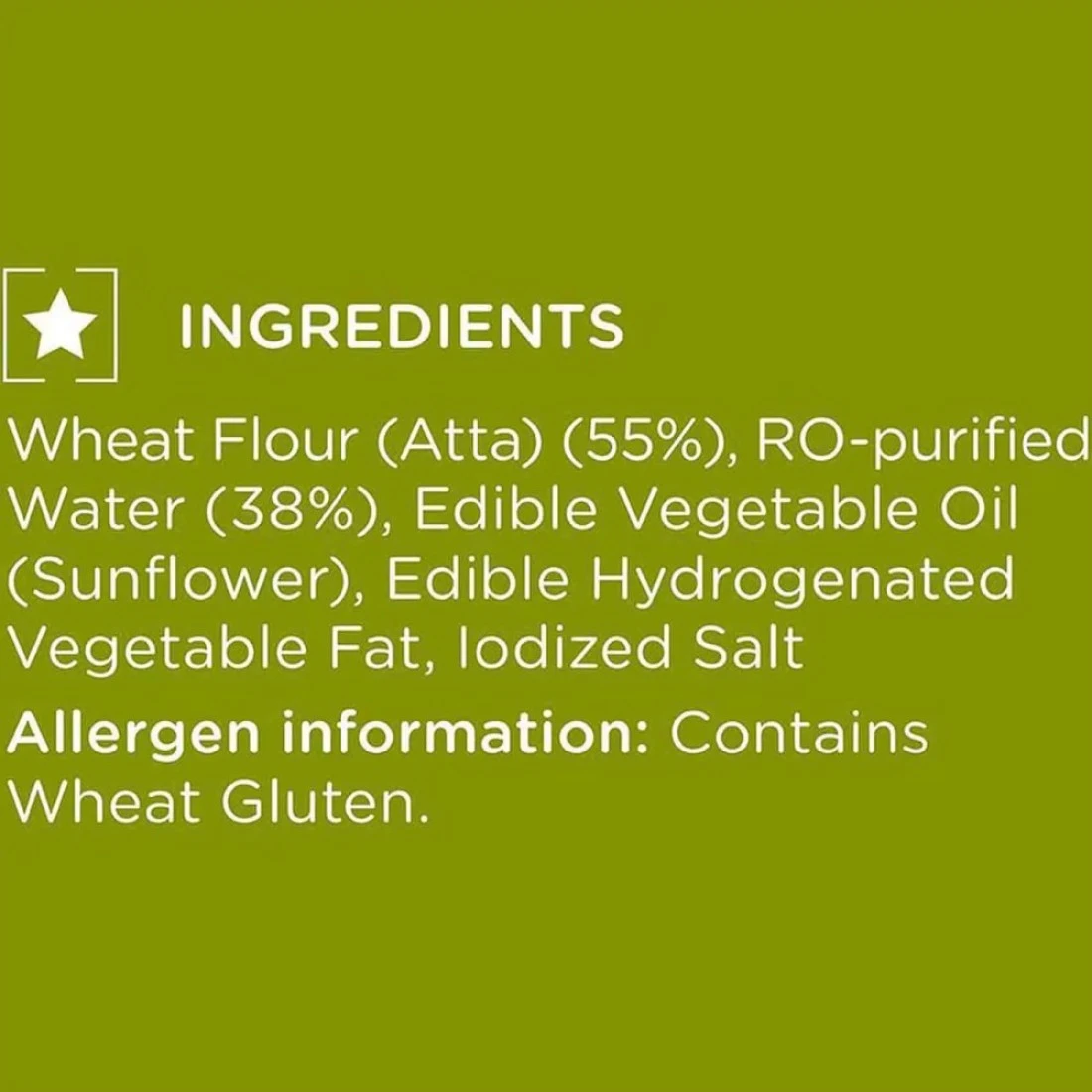 ingredients : Whole Wheat Flour, Ro-Purified Water, Edible Vegetable Oil, Edible Vegetable Fat, Edible Common Salt