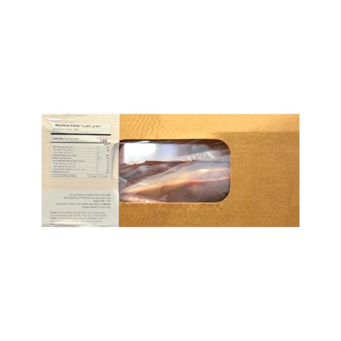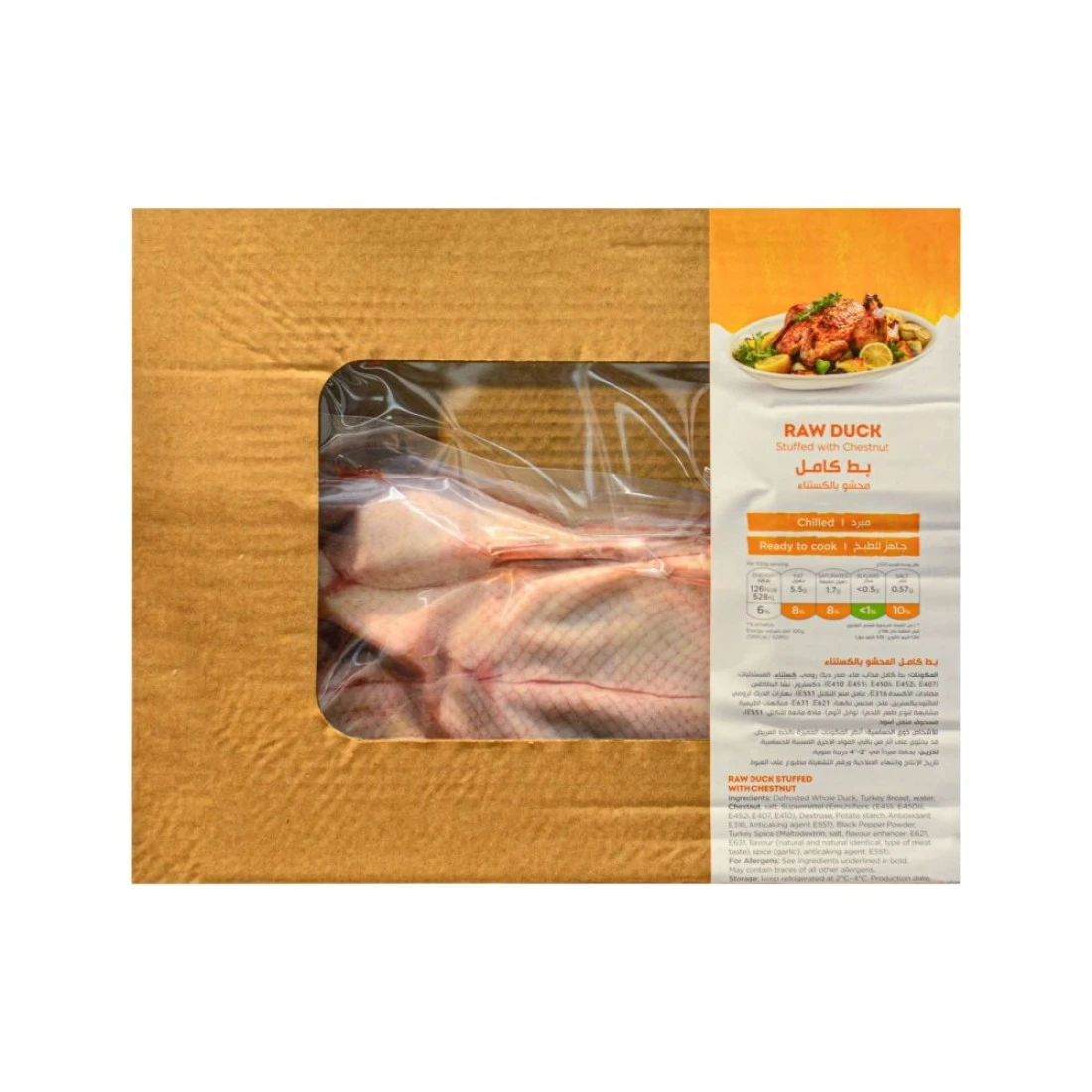 ingredients : Defrosted Whole Duck, Turkey Breast, Water, Chestnuts, Salt, Supermittel (Emulsifiers: (E 451I, E450III, E452I, E407, E410), Dextrose, Potato Starch, Antioxidant (E316), Anti-Caking Agent (E551), Black Pepper Powder, Turkey Spice (Maltodextrin, Salt, Flavour Enhancer: E621, E631, Flavour (Natural and Natural Identical Type of Meat Taste), Spice (Garlic) and Anti-Caking Agent (E551).