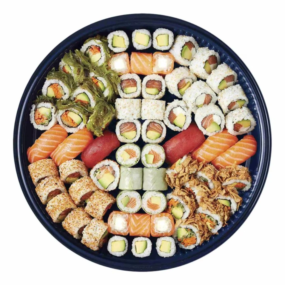 ingredients : Vinegared Sushi Rice, Salmon, Tuna, Surimi, Cream Cheese, Seaweed Salad, Avocado, Cucumber, Fried Onions, Spicy Mayo (Mayonnaise, Sriracha), Sushi Sauce, Nori Seaweed, Shichimi Spice, White Sesame Seed, Lettuce, Soy Sauce, Coriander, Mint, Sesame Oil, 4 Salmon Nigiri, 2 Tuna Nigiri, 8 Crunch Veggie Roll, 8 Wakame Veggie Roll, 9 Spicy Salmon Roll, 9 Salmon Cheese Roll, 6 Californiafornia Maki, 6 Salmon Verde Maki, 6 Rollin' Salmon Cheese and 6 Avocado Maki.