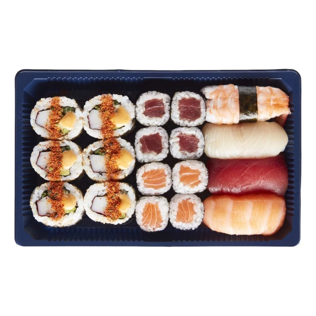 ingredients : Vinegared Sushi Rice, Tuna, Salmon, Surimi, Prawn, Avocado, Cucumber, Seabream, Spicy Mayo (Mayonnaise. Sriracha), Nori Seaweed, White Sesame Seed and Shichimi. One order of Sushi Daily Platter is composed of 6 Spicy Californiafornia, 4 Tuna Maki, 4 Salmon Maki, 1 Nigiri Salmon, 1 Nigiri Seabream, 1 Tuna Nigiri and 1 Prawn Nigiri.