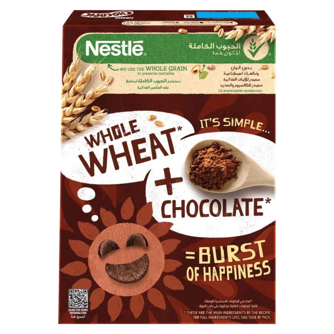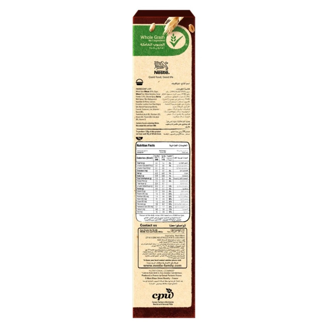 ingredients : Cereal Grains 61.9 percent Whole Grain Wheat contains Gluten 31.8 percent Wheat Flour contains Gluten 15.8 percent Maize Semolina 14.3 percent Sugar Cocoa Powder 7.1 percent Glucose Syrup Barley Malt Extract contains Gluten Palm Oil Emulsifier from Plant origin Sunflower Lecithin Salt Artificial Flavourings Vanillin and Cinnamon. Vitamins and Minerals Niacin Pantothenic Acid Riboflavin B2 Vitamin B6 Thiamine B1 Folic Acid Vitamin D Calcium Carbonate Iron. Contains Cereals containing gluten May contain traces of Milk Almonds Peanuts and other Nuts