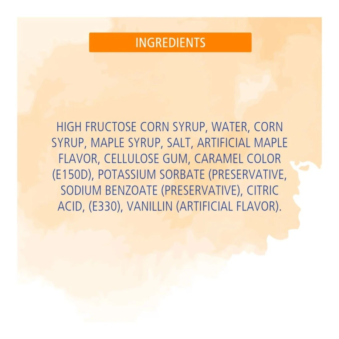 ingredients : High Fructose Corn Syrup, Corn Syrup, Water, Maple Syrup, Salt, Artificial Flavour, Cellulose Gum, Caramel Colour (e150d), Potassium Sorbate (Preservative), Sodium Benzoate (Preservative), Citric Acid (e330), Vanillin (An Artificial Flavour)