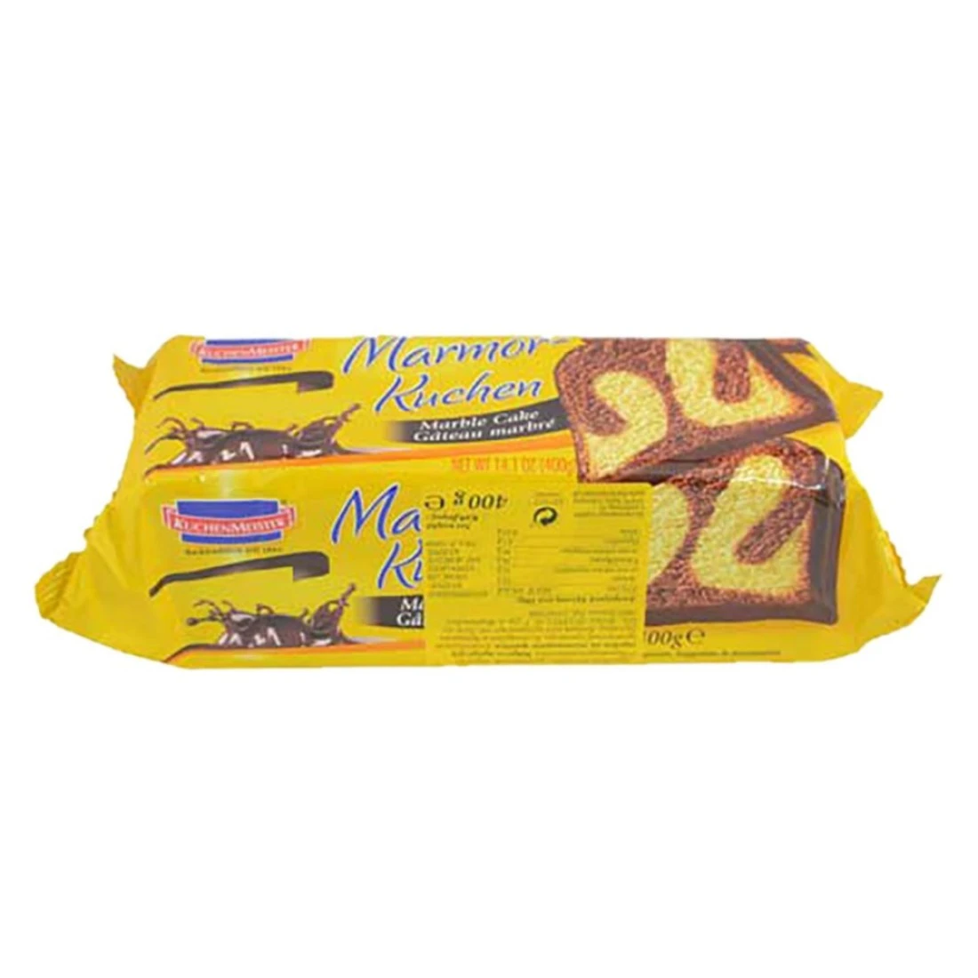 Kuchen Meister Marble Cake is a delicious treat for all occasions. Made with moist layers of white and chocolate cake this delightful cake is topped with a creamy chocolate frosting and a marbled pattern that is sure to please. Each 400g cake comes pre-sliced and ready to enjoy making it an easy addition to any party table. Enjoy the taste of Kuchen Meister Marble Cake today.
