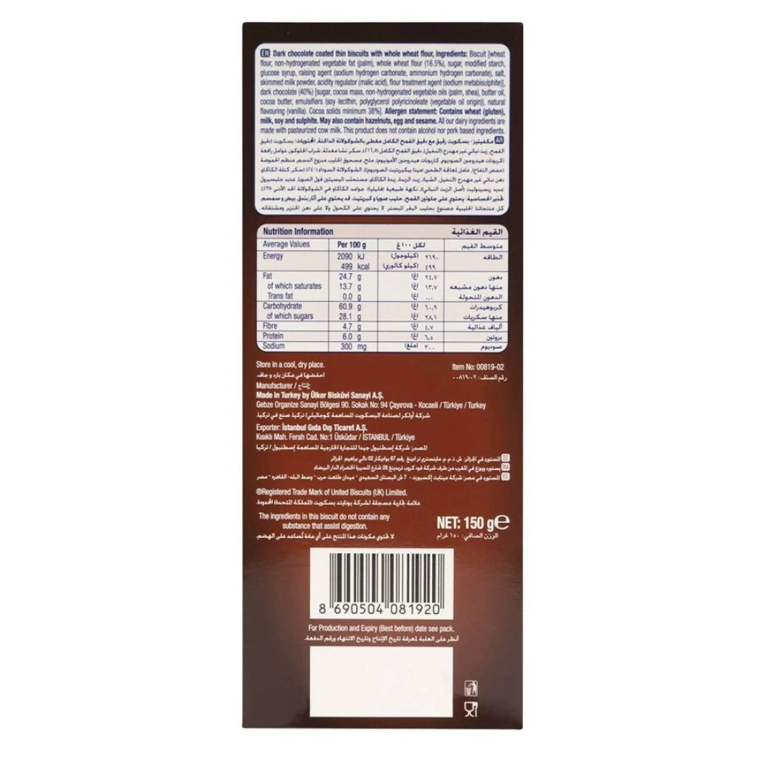 ingredients : Biscuits [Wheat Flour, Non-hydrogenated Vegetable Fat (Palm), Whole Wheat Flour (16.5%), Sugar, Modified Starch, Glucose Syrup, Raising Agent (Sodium Hydrogen Carbonate, Ammonium Hydrogen Carbonate), Salt, Skimmed Milk Powder