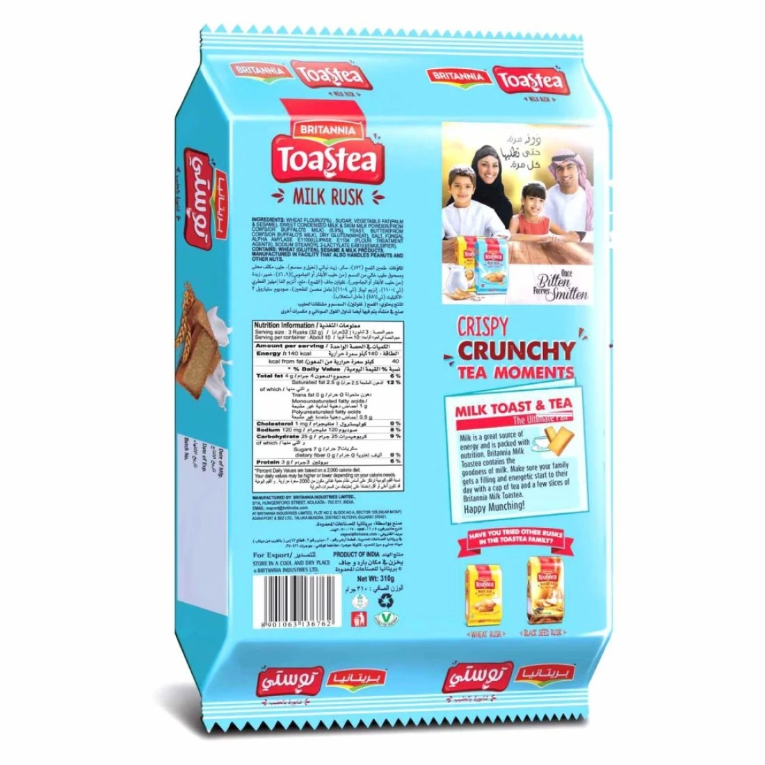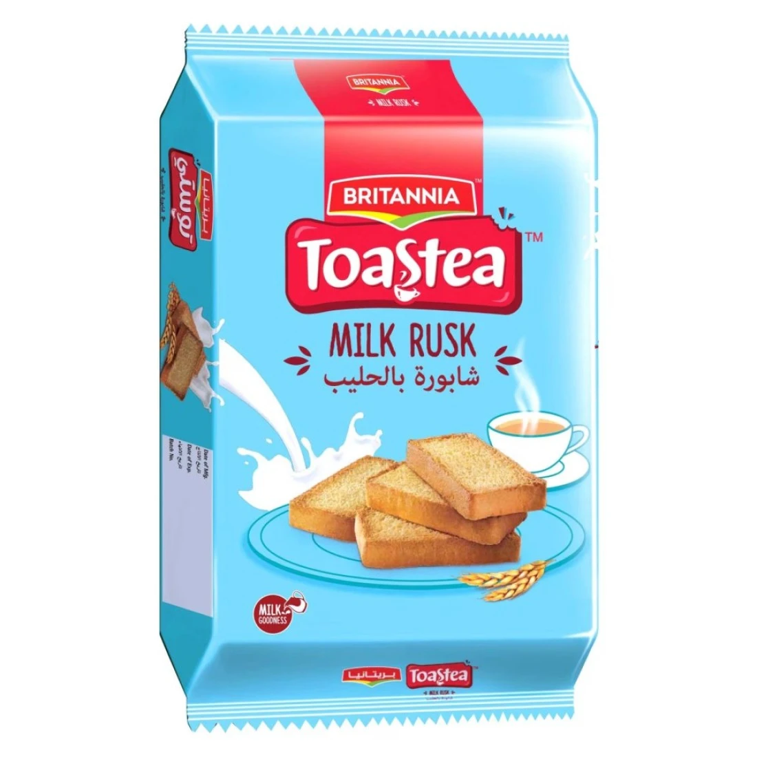 It is as crispy as your traditional rusk but with a hint of elaichi and the right amount of sweetness: its taste will leave you amazed. Britannia Toastea Premium Bake Rusk for long has been a part of every home sharing those moments of joy. Britannia Milk Rusk is a delicious and crunchy snack that is perfect for tea time. Made with the goodness of milk, these rusks have a rich and creamy flavour that will leave you wanting more. They are perfect for dipping in your favourite hot beverage or enjoying on their own. Each pack of Britannia Milk Rusk contains 315g of these tasty treats, making it perfect for sharing with family and friends. Whether you're hosting a gathering or simply craving a snack, these rusks are a great choice. They are also a convenient option for on-the-go snacking, as they are individually wrapped for freshness. Britannia is a trusted brand known for its high-quality products, and their Milk Rusk is no exception. Made with the finest ingredients, these rusks are baked to perfection to ensure a crispy texture and delicious taste. So why wait? Grab a pack of Britannia Milk Rusk and indulge in a delightful snacking experience.