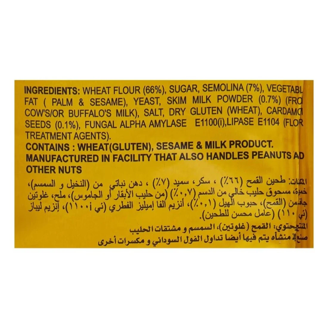 ingredients : Wheat Flour (66%), Sugar, Semolina (7%), Vegetable Fat (Palm & Sesame), Yeast, Skim Milk Powder (0.7%) (From Cow's Or Buffalo's Milk), Salt, Dry Gluten (Wheat), Cardamom Seeds (0.1%), Fungal Alpha Amylase E1100(i), Lipase E1104 (Flour Treatment Agents)