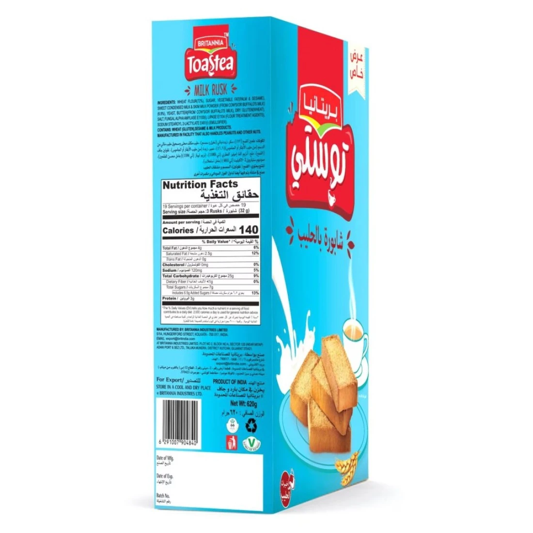 It is as crispy as your traditional rusk but with a hint of elaichi and the right amount of sweetness: its taste will leave you amazed. Britannia Toastea Premium Bake Rusk for long has been a part of every home sharing those moments of joy. Britannia Milk Rusk Toast is a delicious and crunchy snack that is perfect for tea time or as a quick breakfast option. Made with the goodness of milk, these rusks have a light and airy texture that is sure to satisfy your taste buds. The 620g pack is great for sharing with family and friends, and the resealable packaging ensures that the rusks stay fresh for longer. Enjoy the rich and comforting taste of Britannia Milk Rusk Toast with a hot cup of tea or coffee. These rusks are made using the finest ingredients and are baked to perfection, giving them a delightful crunch. Whether you enjoy them plain or with a spread of butter or jam, these rusks are sure to be a hit with everyone. Britannia Milk Rusk Toast is a versatile snack that can be enjoyed at any time of the day. Whether you need a quick bite on the go or a tasty treat to accompany your evening tea, these rusks are the perfect choice. With their delicious flavour and satisfying crunch, Britannia Milk Rusk Toast is a must-have for every pantry.