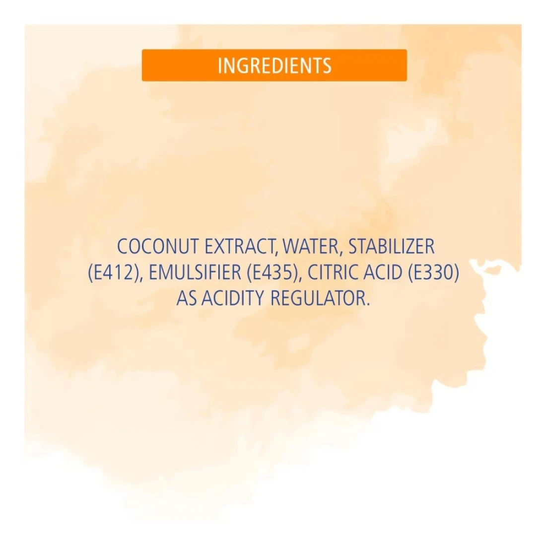 ingredients : Coconut Extract, Water, Stabilizer (E412), Emulsifier (E435), Citric Acid (E330) As Acidity Regulator