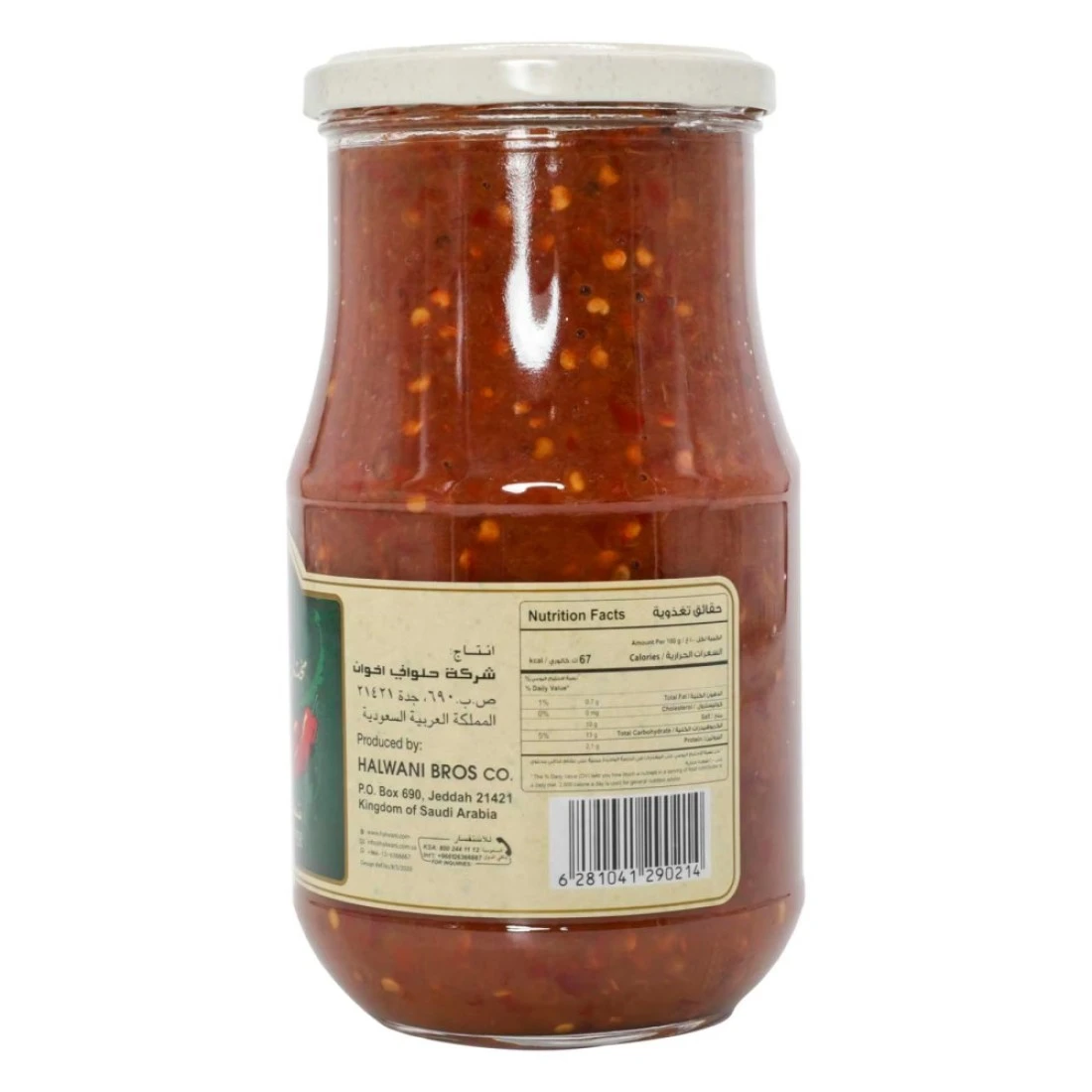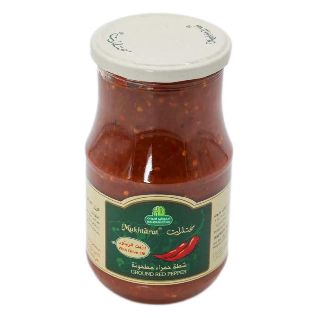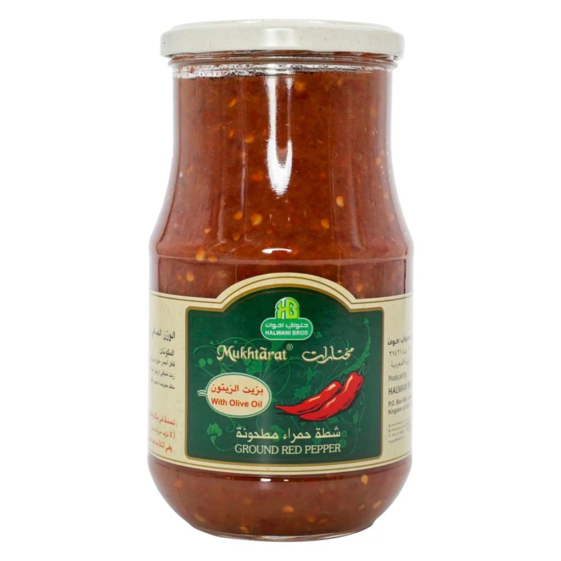 Halwani Bros Mukhtarat Ground Red Pepper In Olive Oil is a spicy and flavourful condiment made from ground red pepper and blended with high-quality olive oil. It is commonly used in Middle Eastern and Mediterranean cuisines to add heat and a rich taste to various dishes. This 750g jar of Mukhtarat Ground Red Pepper is made with carefully selected red peppers that are ground to perfection and mixed with olive oil to create a smooth and versatile paste. It can be used as a marinade for meats added as a topping to pizzas and sandwiches or mixed into sauces and stews to enhance their flavour. The convenient jar packaging makes it easy to use and store. Whether you're a spice lover or simply looking to add some extra flavour to your meals Halwani Bros Mukhtarat Ground Red Pepper In Olive Oil is a must-have pantry staple.