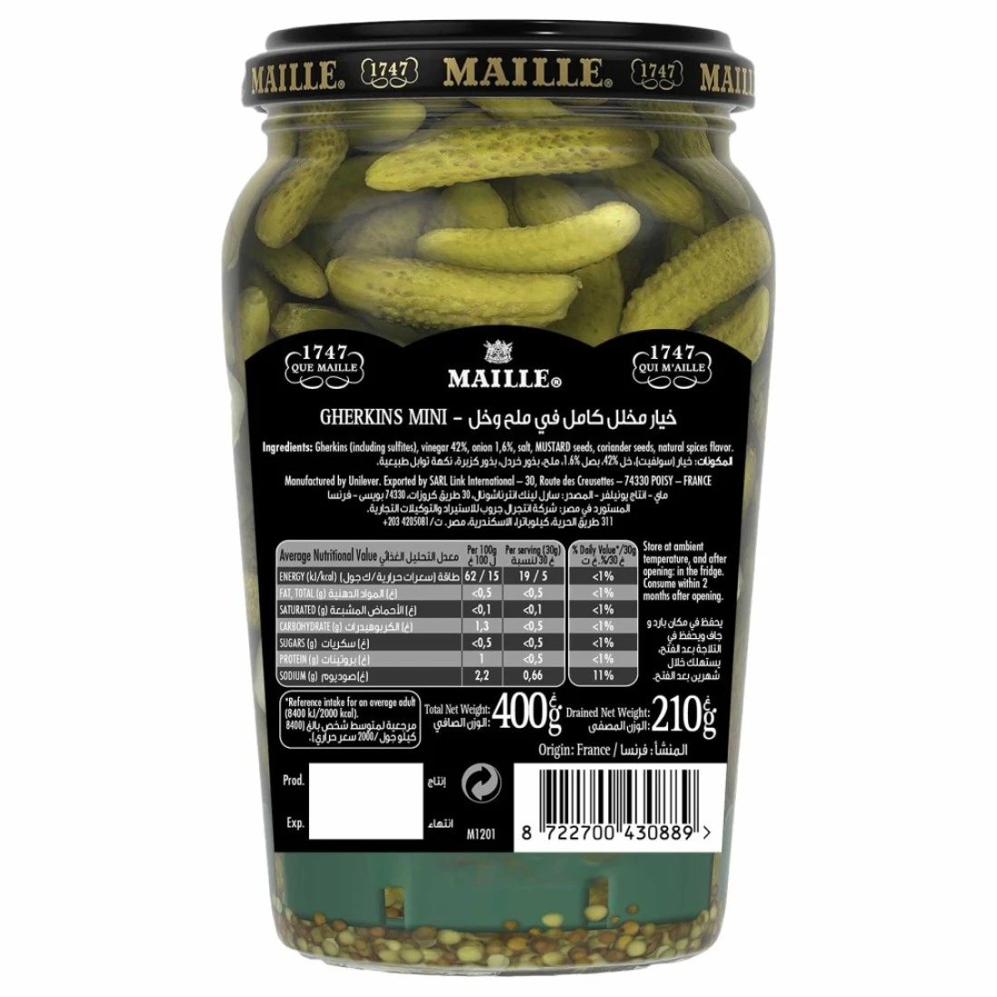 - Maille Mini Gherkins have a weight of 210 grams, perfect for sharing or personal use