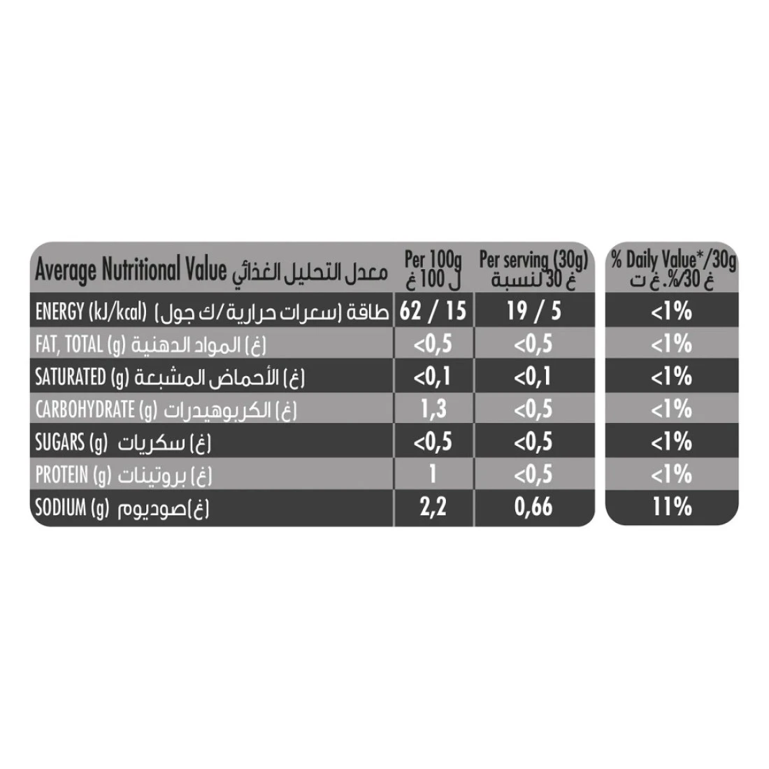 ingredients : Energy in kcal: 13kcal, Energy in kJ: 58kJ, Carbohydrates: 2g, Sugar: 0.7g, Protein: 0.6g, Fat: 0.5g, Fibre: 0.5g, Sodium: 2g, Salt: 2.3g