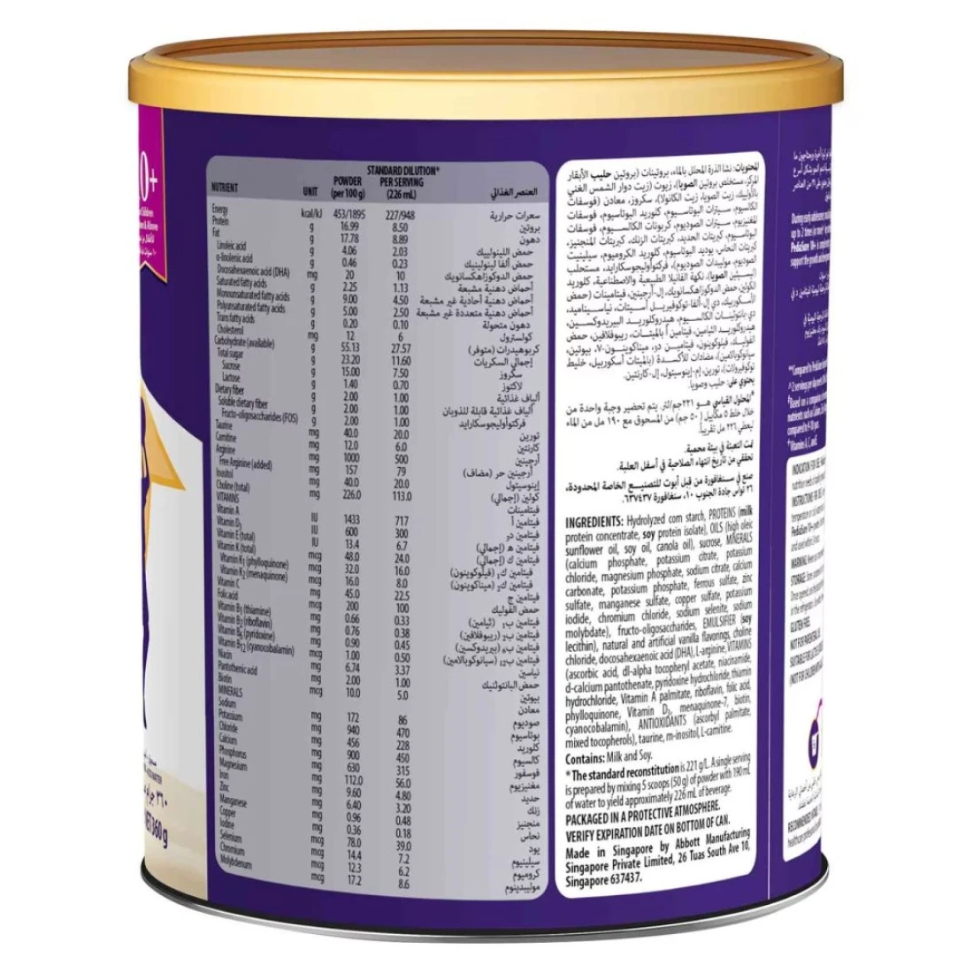 ingredients : Hydrolyzed Corn Starch, Proteins (Milk Protein Concentrate, Soy Protein Isolate), Oils (High Oleic Sunflower Oil, Soy Oil, Canola Oil), Sucrose, Minerals (Calcium Phosphate, Potassium Citrate, Potassium Chloride, Magnesium Phosphate, Sodium Citrate, Calcium Carbonate, Potassium Phosphate, Ferrous Sulfate, Zinc Sulfate, Manganese Sulfate, Copper Sulfate, Potassium Iodide, Chromium Chloride, Sodium Selenite, Sodium Molybdate), Fructo-oligosaccharides, Emulsifier (Soy Lecithin), Natural And Artificial Vanilla Flavourings, Choline Chloride, Docosahexaenoic Acid (DHA), L-arginine, Vitamins (Ascorbic Acid, Dl-alpha Tocopheryl Acetate, Niacinamide, D-calcium Pantothenate, Pyridoxine Hydrochloride, Thiamine Hydrochloride, Vitamin A Palmitate, Riboflavin, Folic Acid, Phylloquinone, Vitamin D3, Menaquinone-7, Biotin, Cyanocobalamin), Antioxidants (Ascorbyl Palmitate, Mixed Tocopherols), Taurine, M-inositol, L-camitine