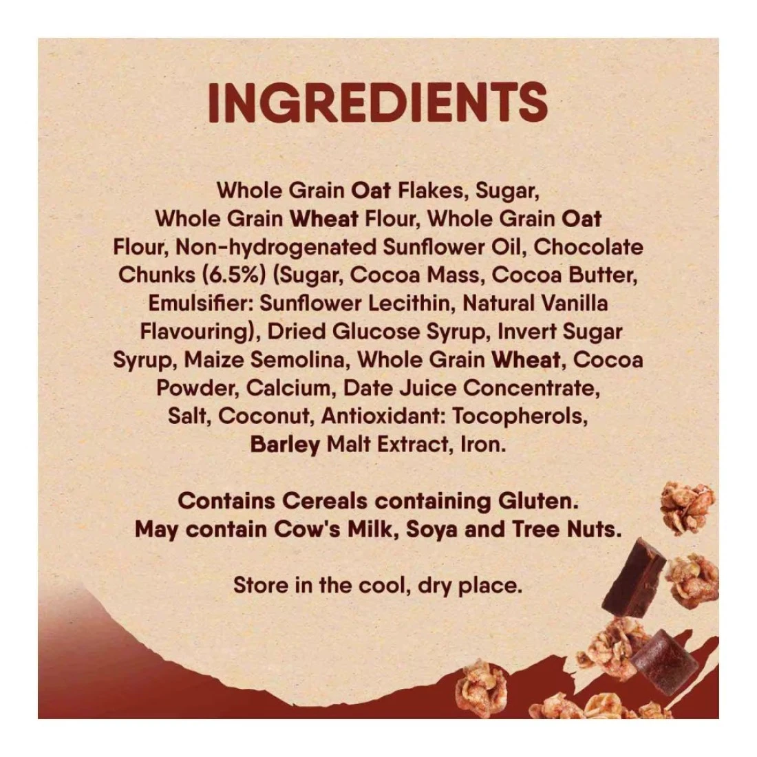 ingredients : Whole Grain Oat Flakes, Sugar, Whole Grain Wheat Flour, Whole Grain Oat Flour, Non-hydrogenated Sunflower Oil, Dried Glucose Syrup, Invert Sugar Syrup, Maize Semolina, Whole Grain Wheat, Honey, Calcium Carbonate, Date Juice Concentrate, Coconut, Natural Honey Flavour, Raising Agent: Sodium Bicarbonate, Salt, Antioxidant: Tocopherols, Barley Malt Extract, Iron. Contains Cereals containing Gluten. May contain Cow's Milk, Soya and Tree Nuts