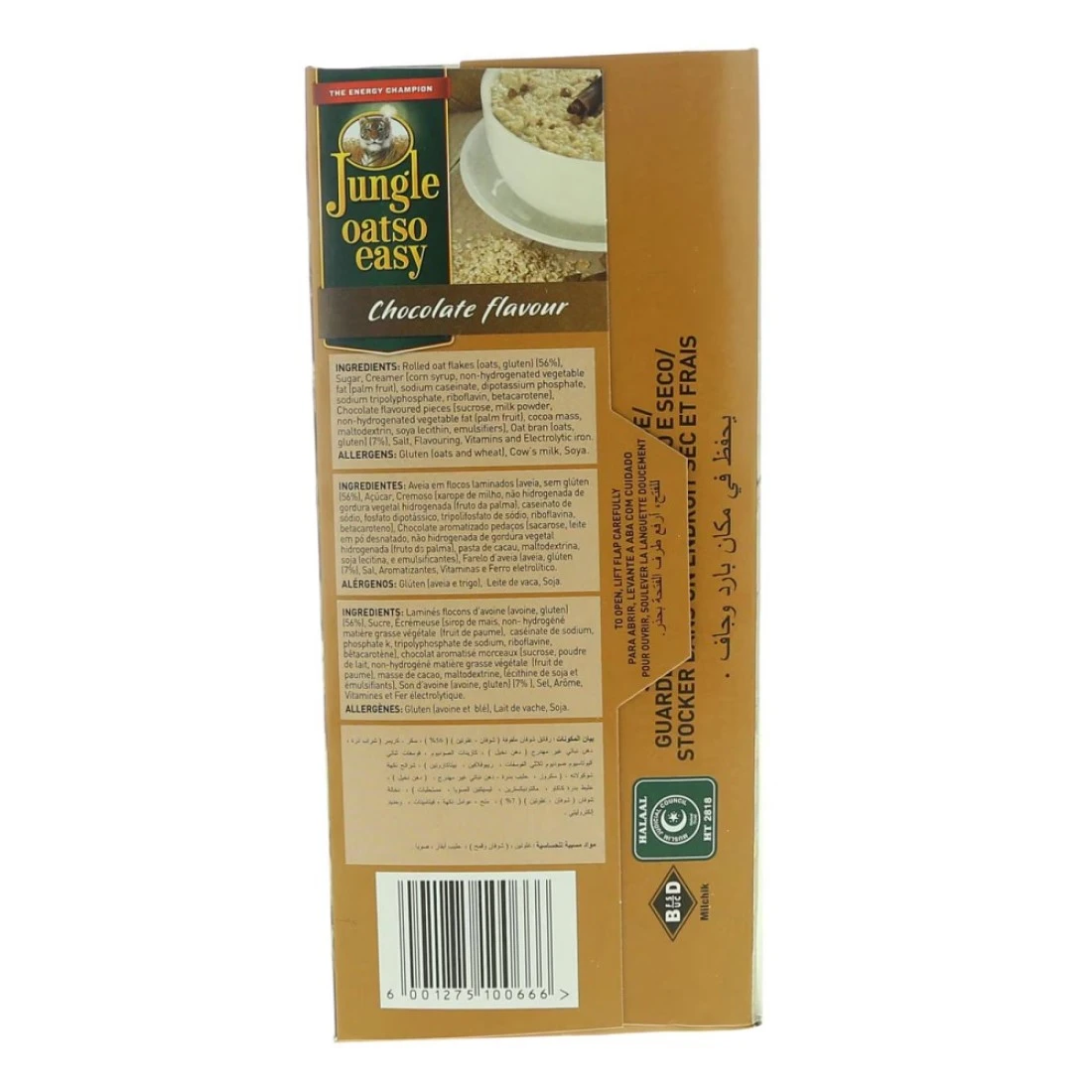 ingredients : Rolled Oat Flakes (Oats, Gluten) (56%), Sugar, Creamer (Corn Syrup, Non-hydrogenated Vegetable Fat (Palm Fruit), Sodium Caseinate, Dipotassium Phosphate, Sodium Tripolyphosphate, Riboflavin, Beta-carotene), Chocolate Favoured Pieces (Sucrose, Milk Powder, Non-hydrogenated Vegetable Fat (Palm Fruit), Cocoa Mass, Maltodextrin, Soya Lecithin, Emulsifiers), Oat Bran (Oats, Gluten) (7%), Salt, Flavouring, Vitamins and Electrolytic Iron