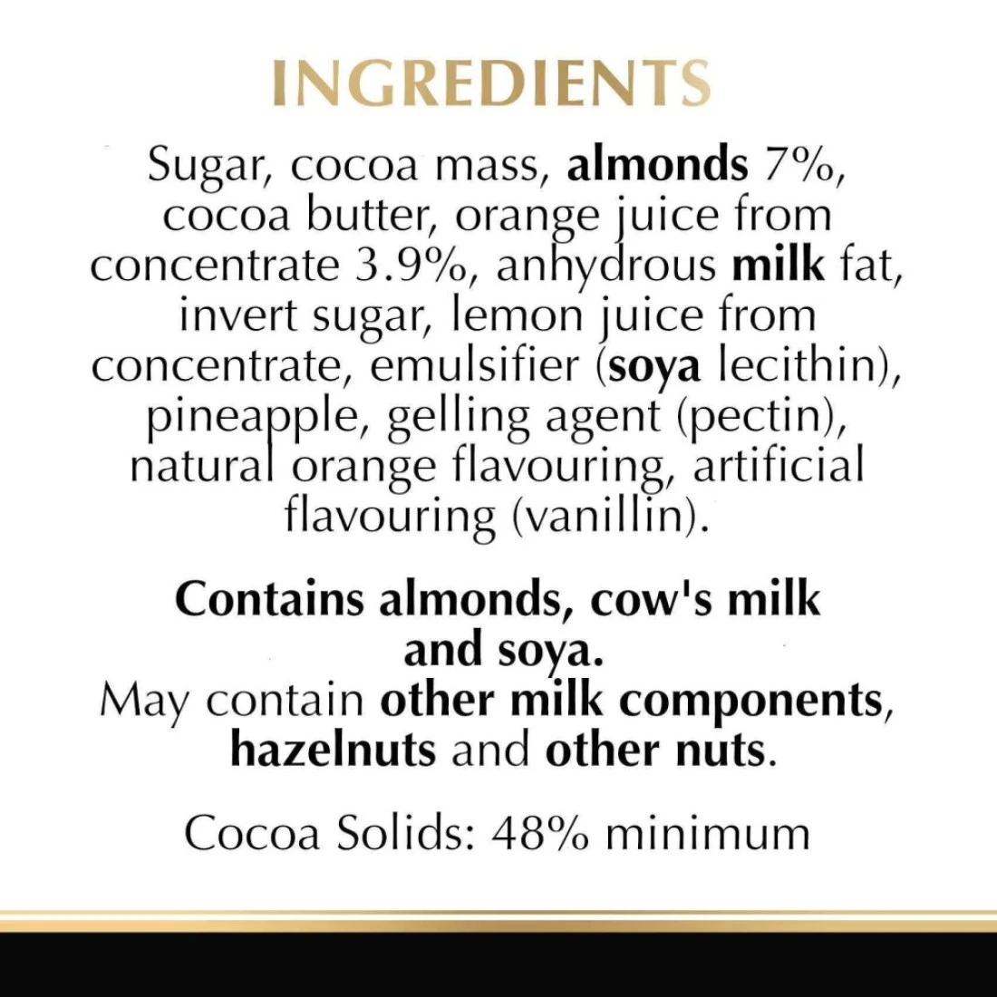 ingredients : Sugar, cocoa mass, orange preparation 7% (orange 34%, sugar, apple, pineapple fibres, acidity regulator (citric acid), gelling agent (sodium alginate), stabiliser (calcium phosphate), natural flavouring (orange)), almonds 7%, cocoa butter, anhydrous milk fat, emulsifier (soya lecithin), natural flavouring (orange) and artificial flavouring (vanillin).