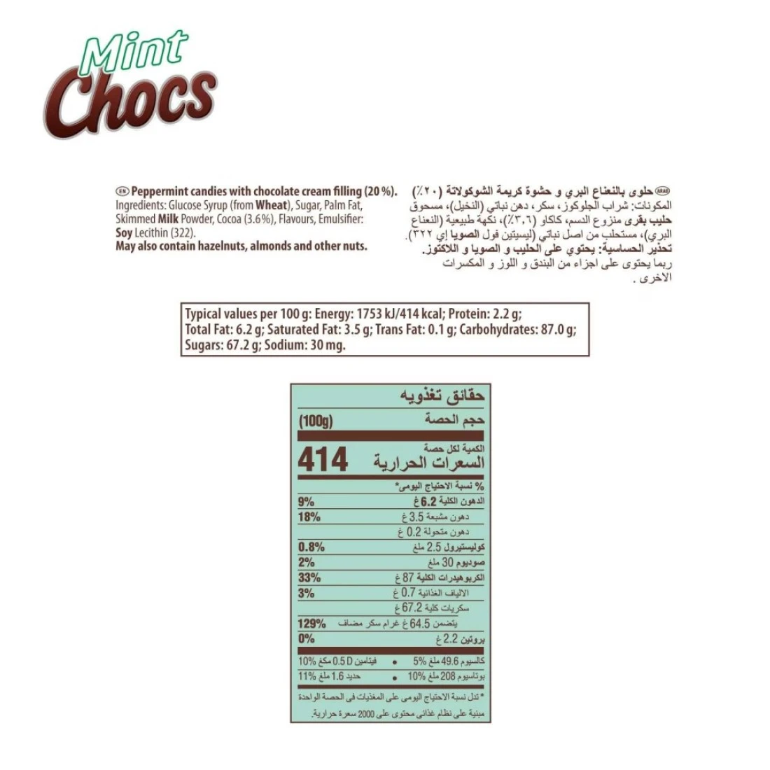 ingredients : Glucose Syrup, Sugar, Palm Fat, Skimmed Milk Powder, Cocoa (3.6%), Flavourings, Emulsifier: Soya Lecithin
