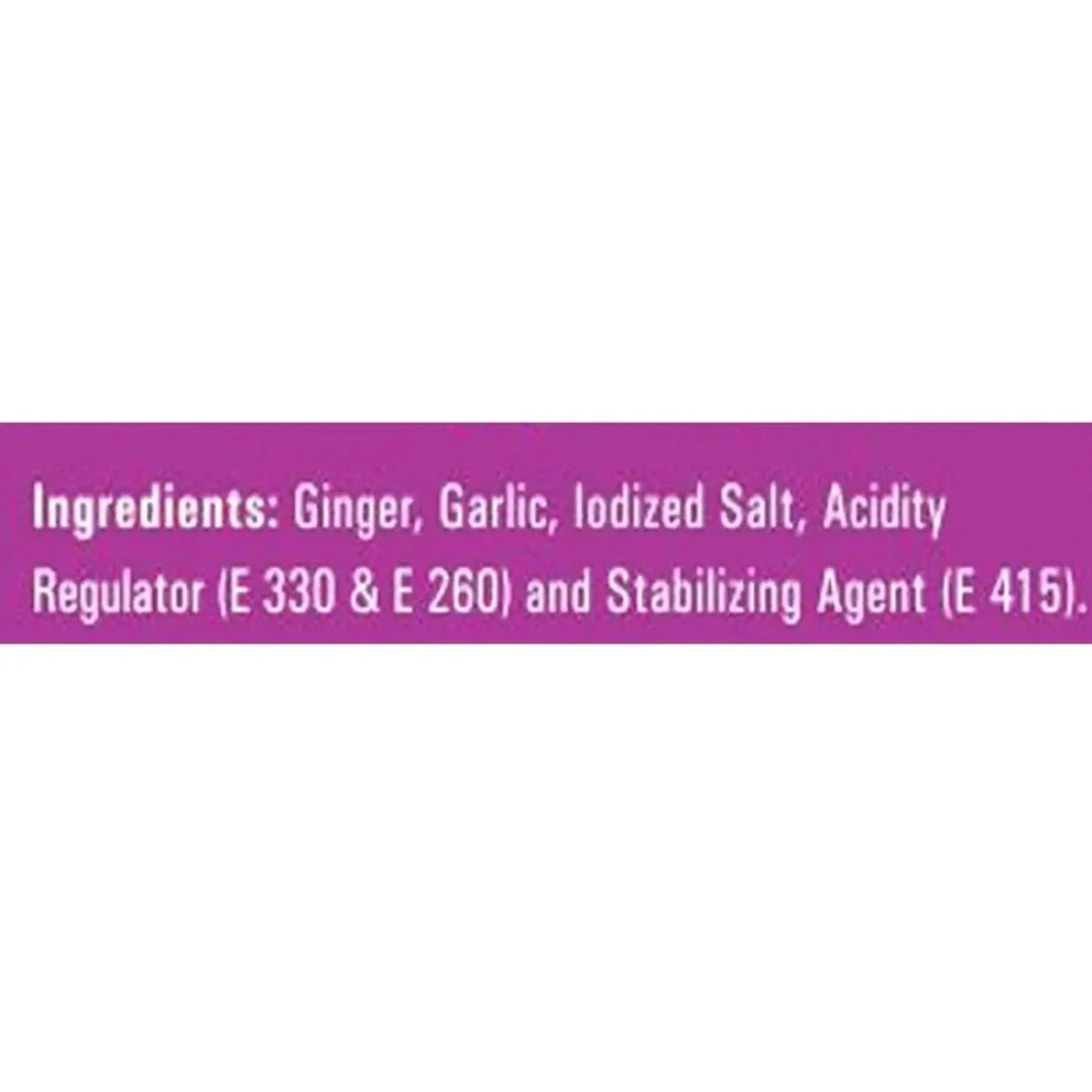 ingredients : Ginger, Garlic, Iodized Salt, Acidity Regulator (e330 & E260), Stabilizing Agent (e415)