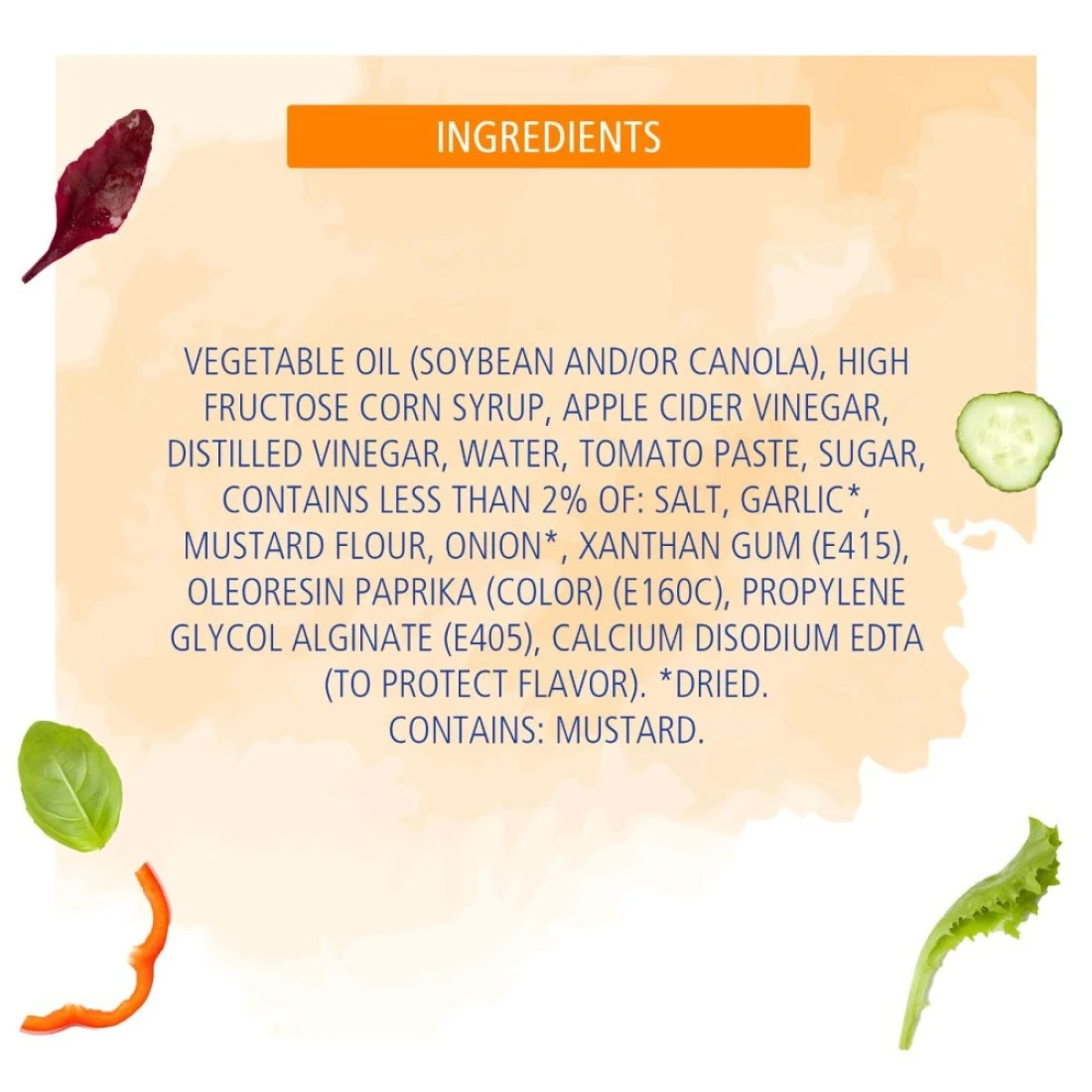 ingredients : Soybean Oil, High Fructose Corn Syrup, Apple Cider Vinegar, Distilled Vinegar, Water, Tomato Paste, Sugar, Contains Less Than 2% Of Salt, Garlic, Mustard Flour, Onion, Xanthan Gum (e415), Oleoresin Paprika (Colour) (e160c), Propylene Glycol Alginate, Calcium Disodium Edta (To Protect Flavour).Dried