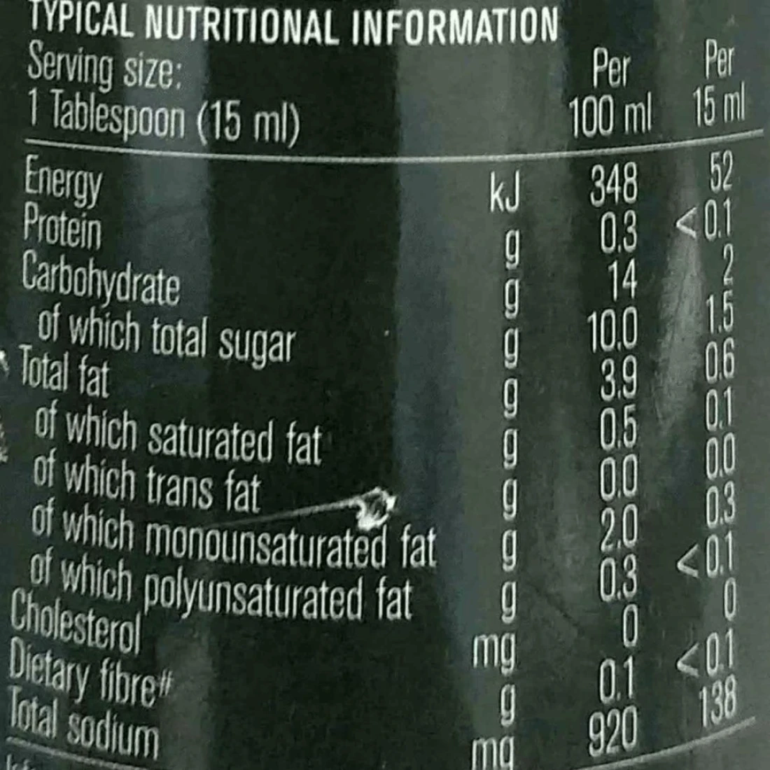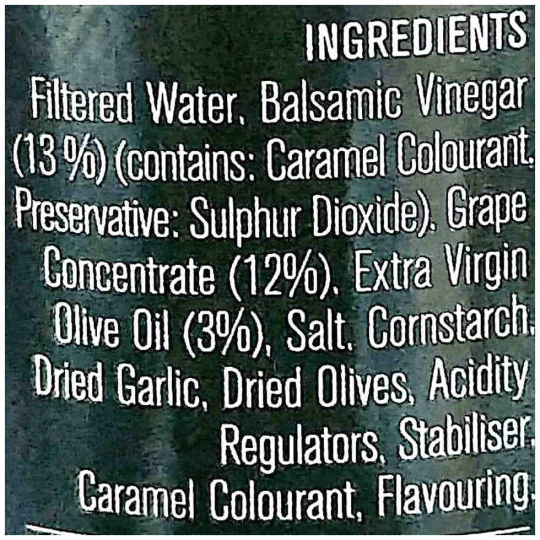 ingredients : Filtered Water, Extra Virgin Olive Oil (16%), Balsamic Vinegar (15%) (Balsamic Vinegar, Caramel Colour, Sulphur Dioxide), Grape Concentrate, Canola Oil (5%) (Antioxidant: Vitamin E), Salt, Corn Starch, Dried Garlic (Radurised), Lactic Acid, Caramel Colourant, Flavouring