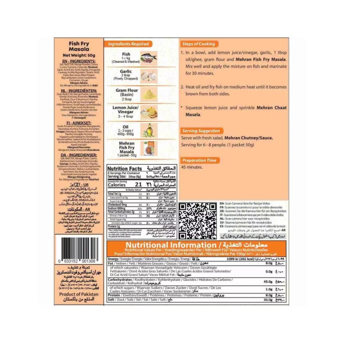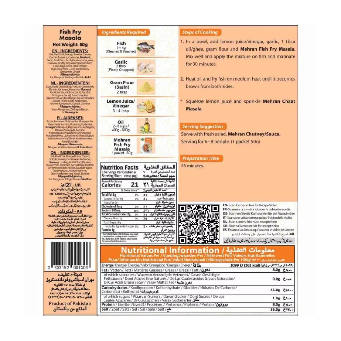 Mehran Fish Fry Masala is a popular spice mix that adds a delicious flavour to fried fish. Made with a blend of aromatic herbs and spices, this masala is perfect for marinating fish before frying. It gives the fish a mouth-watering taste and a crispy texture that is sure to impress your family and friends. With Mehran Fish Fry Masala, you can easily recreate the flavours of your favourite fish fry at home. Simply coat the fish with the masala and let it marinate for a few minutes. Then, fry it until it turns golden brown and crispy. The result is a perfectly seasoned and flavourful fish that is sure to be a hit at any meal. Whether you are a seafood lover or just looking to try something new, Mehran Fish Fry Masala is a must-have in your kitchen. Its unique blend of spices adds a burst of flavour to any fish dish, making it a versatile and delicious addition to your pantry. So, why wait? Grab a pack of Mehran Fish Fry Masala and elevate your next fish fry to a whole new level.