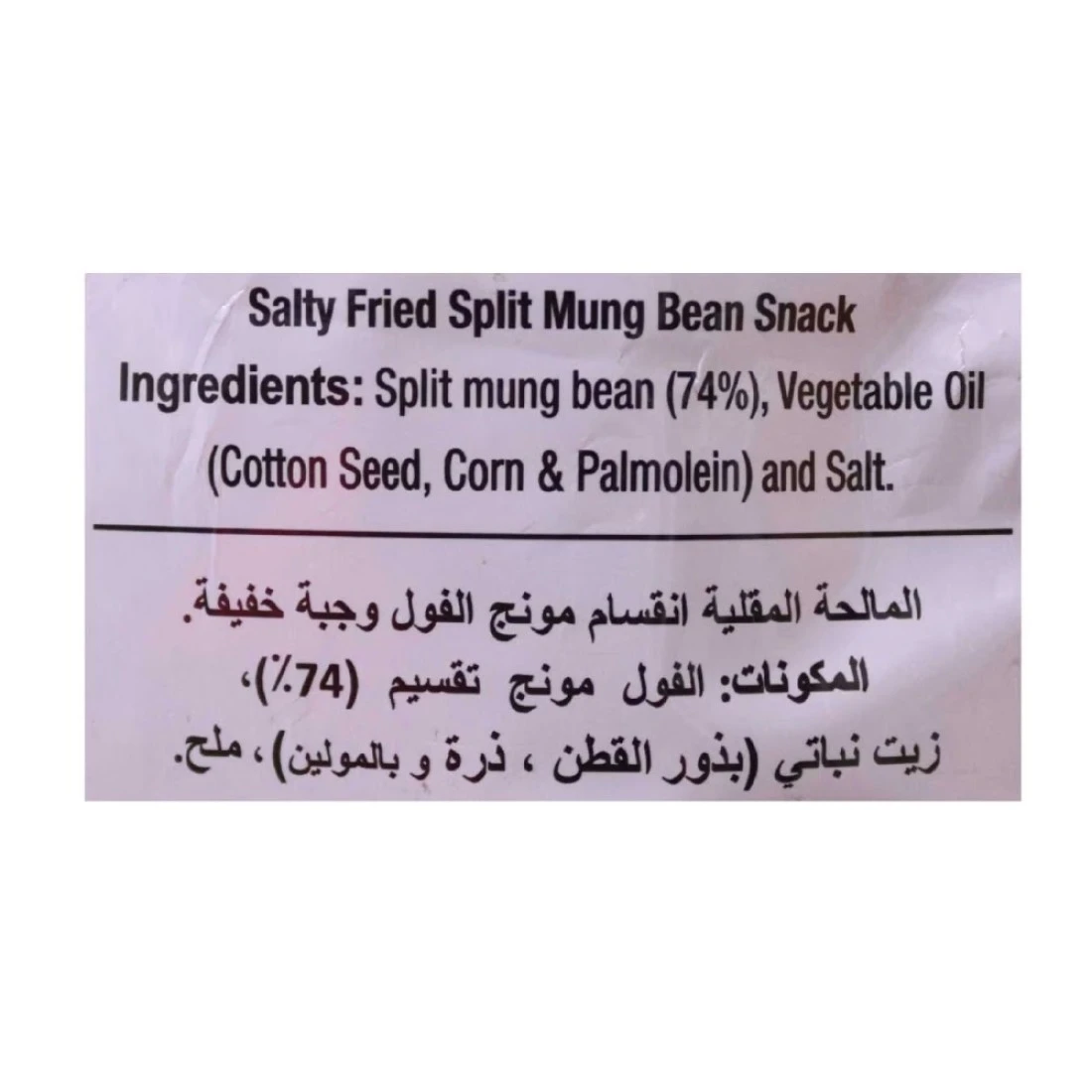 ingredients : Split Green Gram (74%), Edible Vegetable Oil (Cotton Seed, Corn & Palmolein Oil ), Edible Common Salt Powder