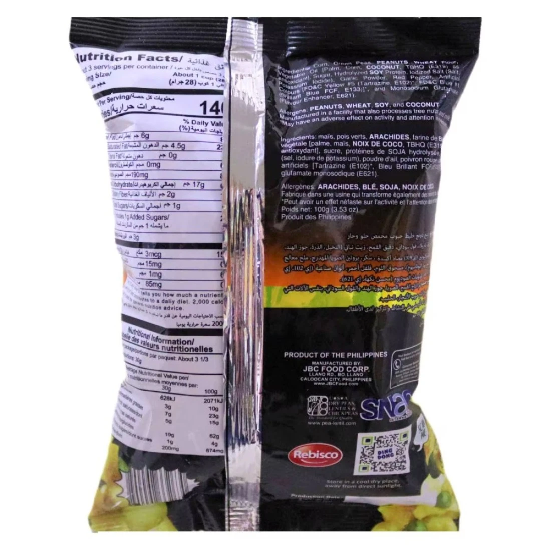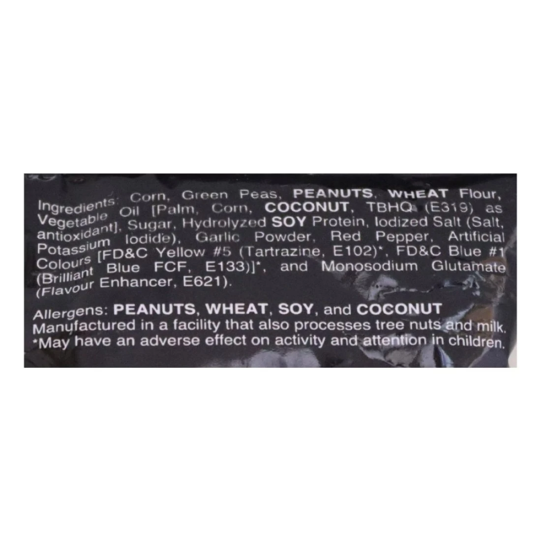ingredients : Corn, Green Peas, Peanuts, Wheat Flour, Vegetable Oil (Palm, Corn and Coconut), Sugar, Hydrolysed Soy Protein, Iodized Salt (Salt Potassium Iodide), Garlic Powder, Red Pepper, Artificial Colour (Fd and C Yellow E102) and (Fd and C Blue E133), Monosodium Glutamate (E621) and Tbhq (Antioxidant)