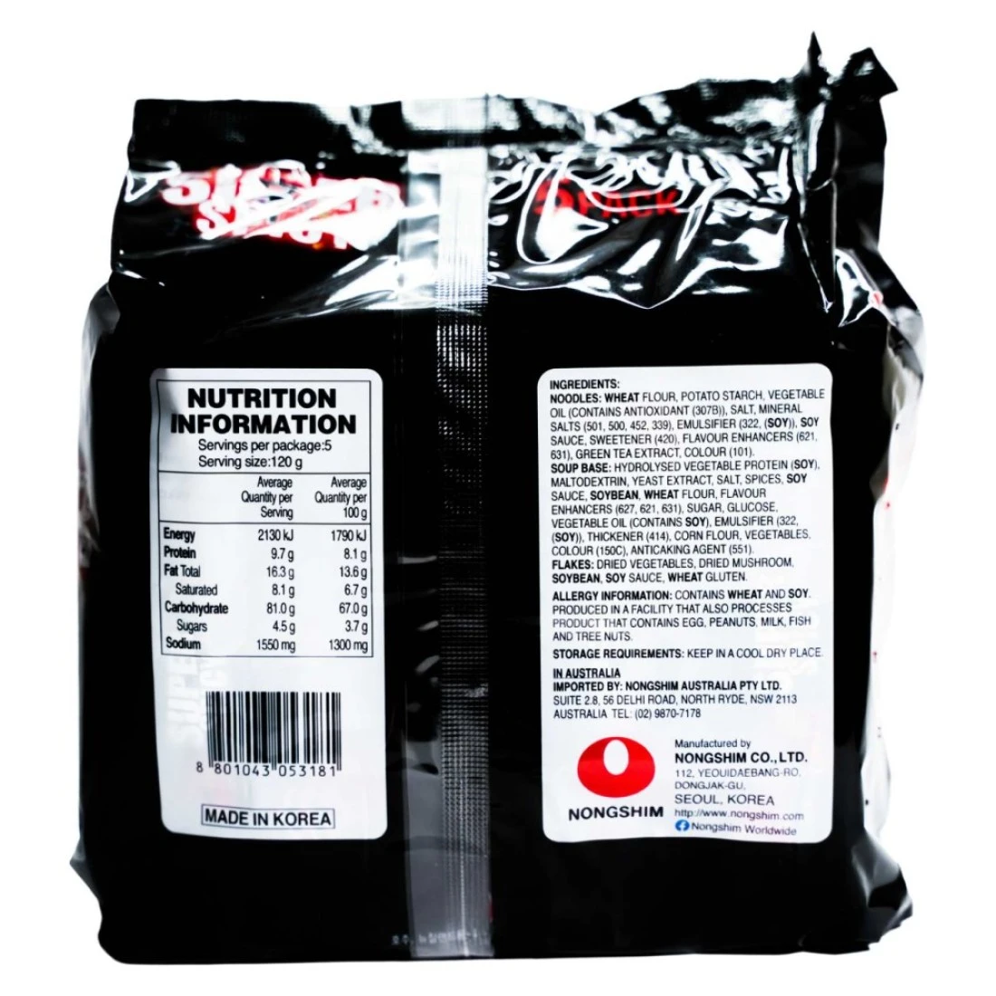 Nongshim Shin Red Super Spicy is a popular instant noodle brand from South Korea. This pack includes 5 individual servings each weighing 120g. The noodles are known for their extra spicy flavour profile perfect for those who love a spicy kick in their meals. Made with a blend of authentic Korean spices the soup base is rich satisfying and guaranteed to leave you wanting more. The noodles themselves are chewy and have a great texture. Convenient and easy to prepare Nongshim Shin Red Super Spicy is a go-to choice for quick and delicious meals.