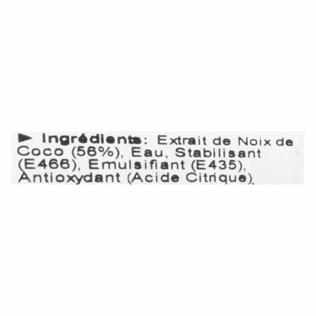 ingredients : Coconut Extract (56%), Water, Stabiliser (E466), Emulsifier (1435), Antioxidant (Citric Acid)