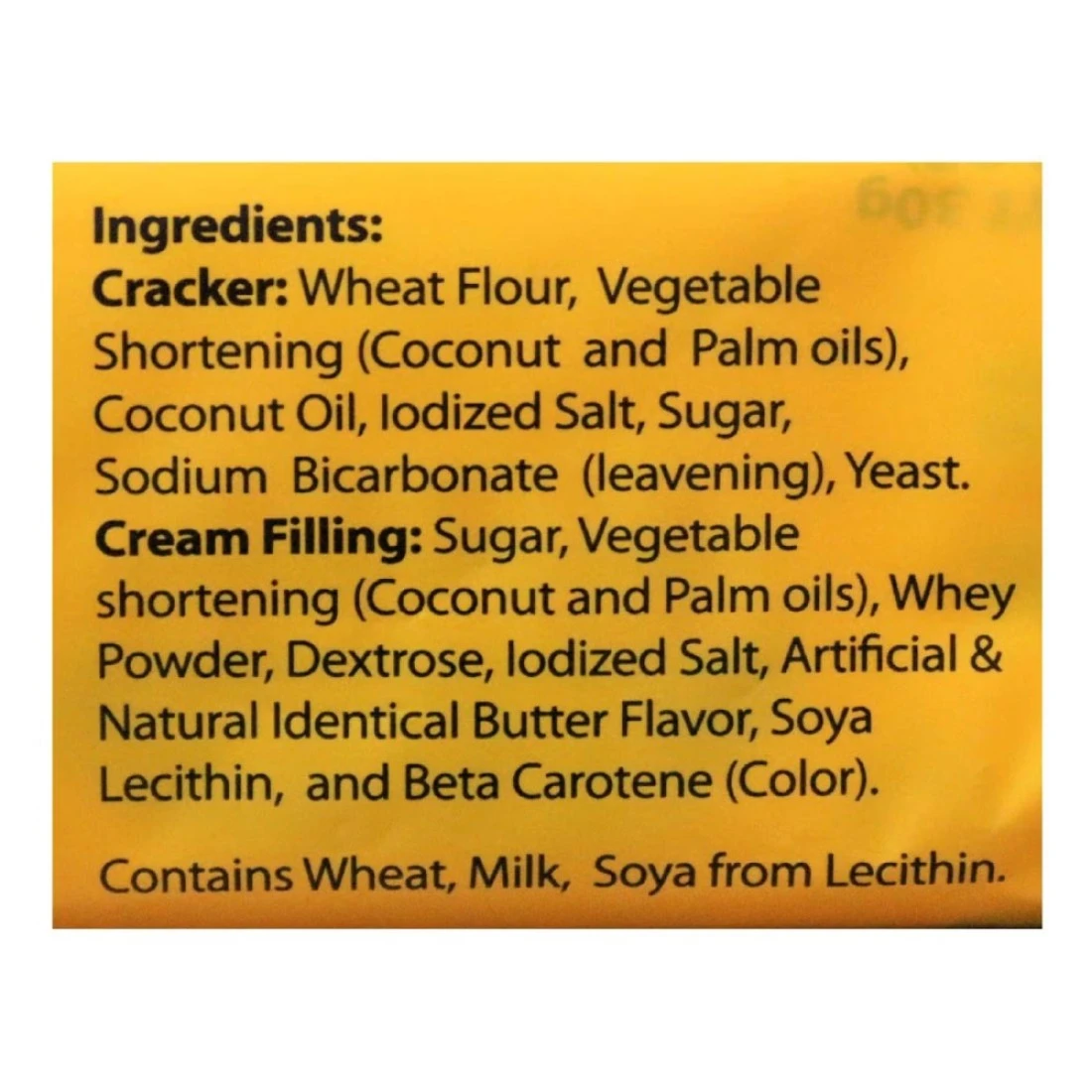 ingredients : Cracker: Wheat Flour, Vegetable Shortening (Coconut and Palm Oils), Coconut Oil, Iodized Salt, Sugar, Sodium Bicarbonate (Leavening), Yeast, Cream Filling: Sugar, Vegetable Shortening (Coconut and Palm Oils), Whey Powder, Dextrose, Iodized Salt, Artificial and Natural Identical Butter Flavour, Soya Lecithin, and Beta Carotene (Colour)