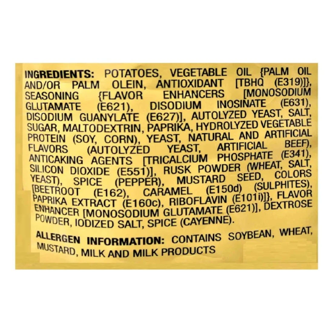 ingredients : Potatoes, Palm Oil, Barbecue Flavour, Salt, Sugar, Vegetable Oil, Malt Dextrin, Silicon Dioxide, Caramel Colour and Dextrose Powder