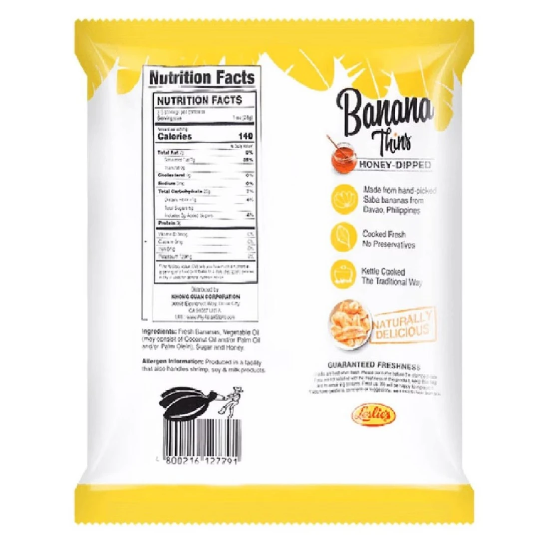 Leslie's Banana Thins Honey-Dipped Banana Chips are a delicious and healthy snack option. Made from real bananas, these thin and crispy chips are coated with a sweet honey glaze for a burst of flavour. Indulge in the natural sweetness of Leslie's Banana Thins Honey-Dipped Banana Chips. These thin and crunchy chips are made from 100% real bananas and are lightly coated with a sweet honey glaze, making them a guilt-free treat for any time of the day. Leslie's Banana Thins Honey-Dipped Banana Chips are the perfect snack for banana lovers. These thin and crispy chips are made from ripe bananas and are delicately dipped in a sweet honey coating, creating a satisfying and wholesome snack option.