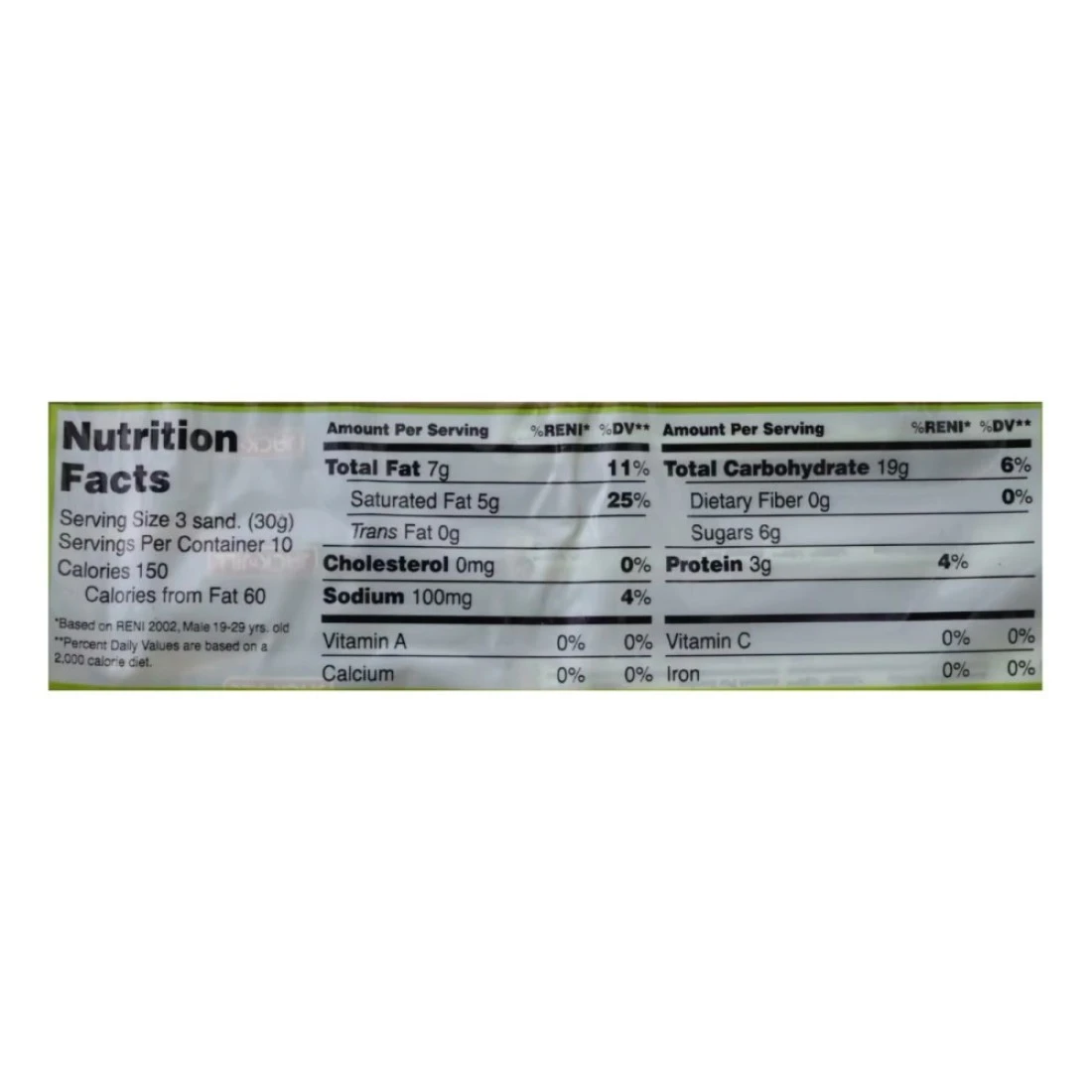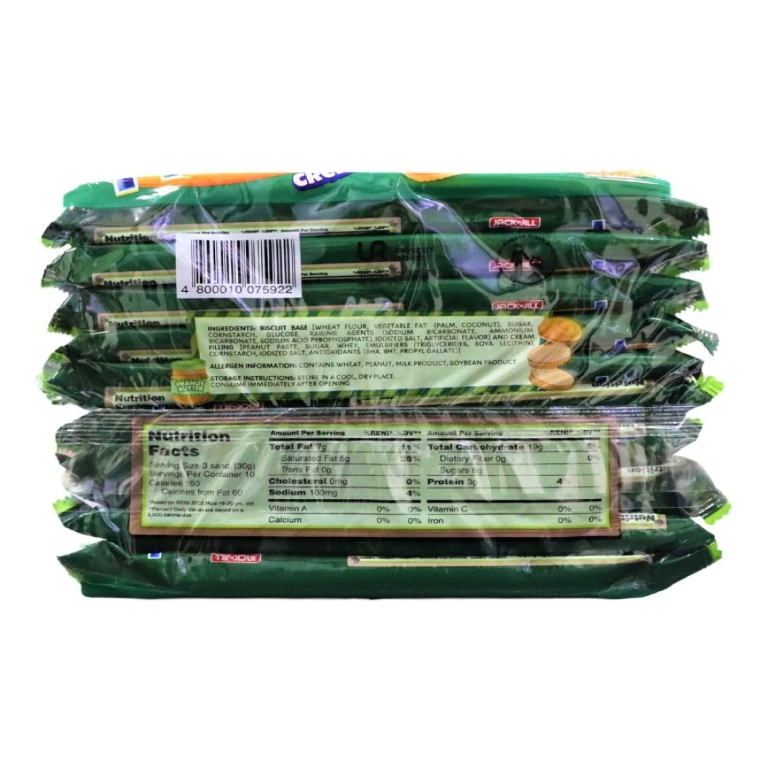 Jack'n Jill Presto Cream Peanut Butter Sandwich Cookies come in a convenient pack of 10 individual 30g packages. These cookies are a delicious snack that combines the rich and creamy taste of peanut butter with a crisp and buttery cookie. Each cookie is filled with a generous amount of peanut butter cream creating a perfect balance of flavours. These cookies are perfect for on-the-go snacking or to enjoy with a cup of tea or coffee. They are also great for sharing with friends and family. The convenient packaging makes it easy to take these cookies with you wherever you go. Whether you're a fan of peanut butter or just looking for a tasty treat Jack'n Jill Presto Cream Peanut Butter Sandwich Cookies are sure to satisfy your cravings.