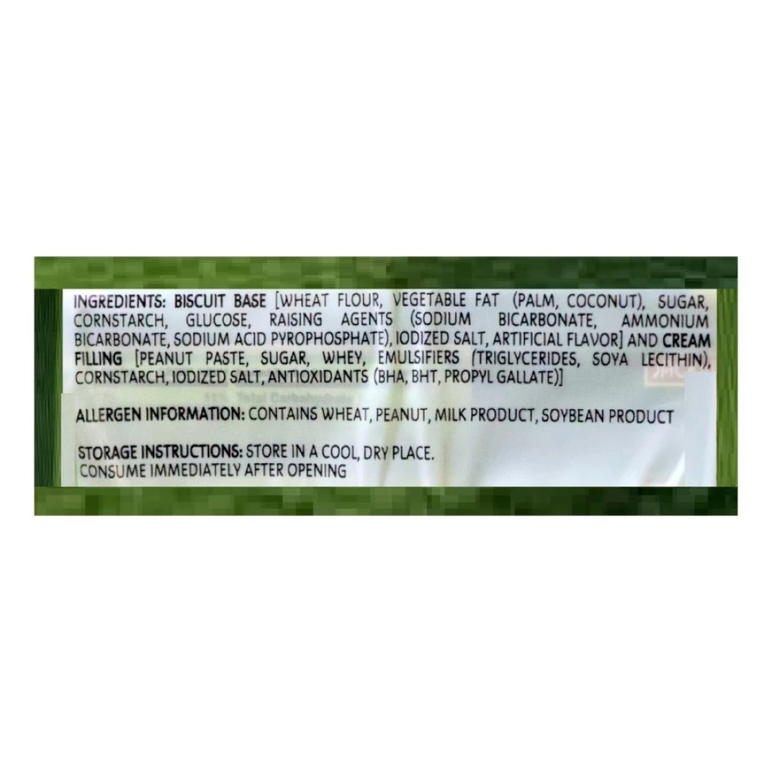 ingredients : Biscuit Base [Wheat Flour, Vegetable Fat (Palm, Coconut), Sugar, Corn-starch, Glucose, Raising Agents (Sodium Bicarbonate, Ammonium Bicarbonate, Sodium Acid Pyrophosphate), Iodized Salt, Artificial Flavour] and Cream Filling [Peanut Paste, Sugar, Whey, Emulsifiers (Triglycerides, Soya Lecithin), Corn-starch, Iodized Salt, Antioxidants (Bha, Bht, Propyl Gallate)