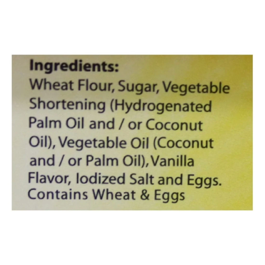 ingredients : Wheat Flour, Sugar, Vegetable Oil, Palm Oil, Coconut Oil, Vanilla Flavour, Iodized Salt, Eggs