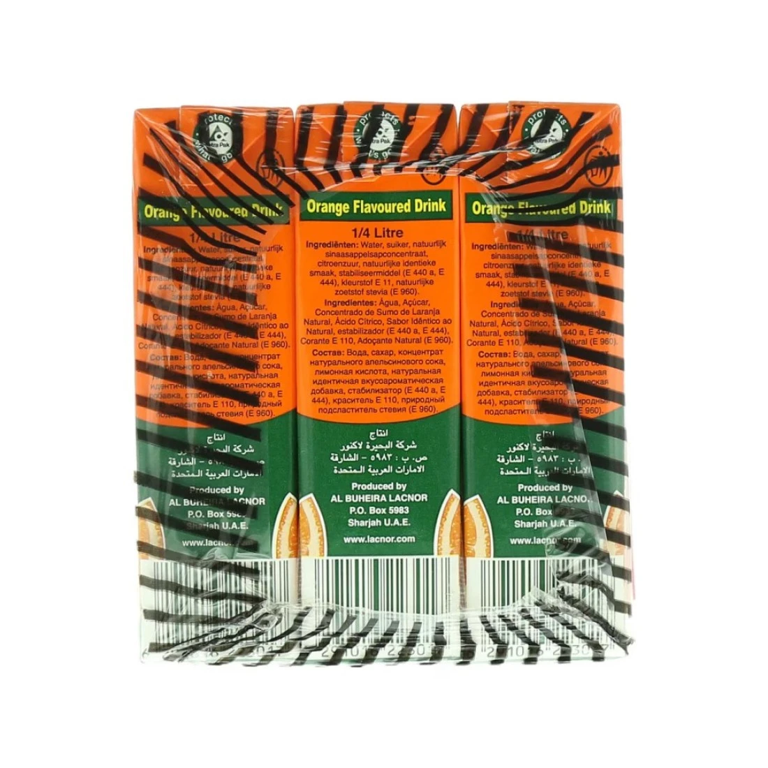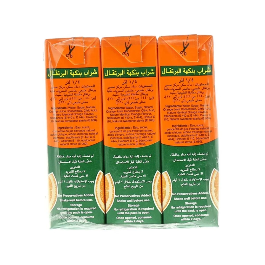 ingredients : Water, Sugar, Natural Orange Concentrate, Citric Acid, Nature Identical Orange Flavour Stabilizer (E440 A, E 444) Colour E 110, Natural Sweetener Stevia (E960)