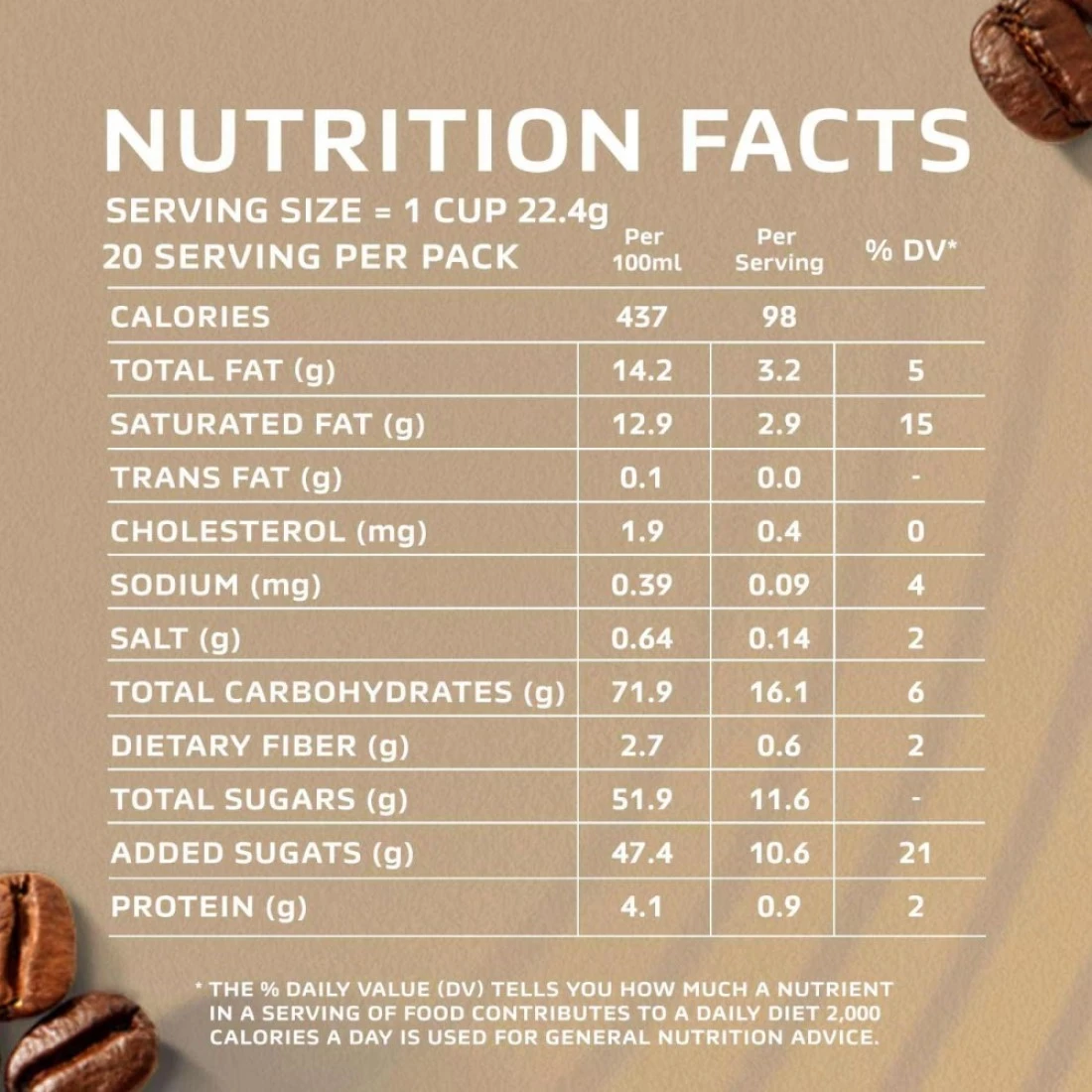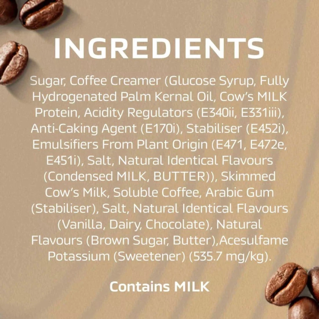 ingredients : Coffee Creamer: Glucose Syrup, Hydrogenated Vegetable Oil (Palm Kernel), Sodium Caseinate (Milk Protein), Acidity Regulators [(E331Iii Plant Origin), E340Ii, E451I, E452Ii], Emulsifiers Of Plant Origin (E471, E472E), Anticaking Agent (Silicon Dioxide), Salt, Natural Identical Dairy Flavour, Sugar (42%), Instant Coffee Powder, Natural Identical Flavours (Mouthfeel, Dairy, Coffee, Chocolate, Brown Sugar), Salt, Caramel, Thickener (Arabic Gum), Natural Cream Flavour, Artificial French Vanilla Flavour, Sweetener (Acesulfame K 0.05%)