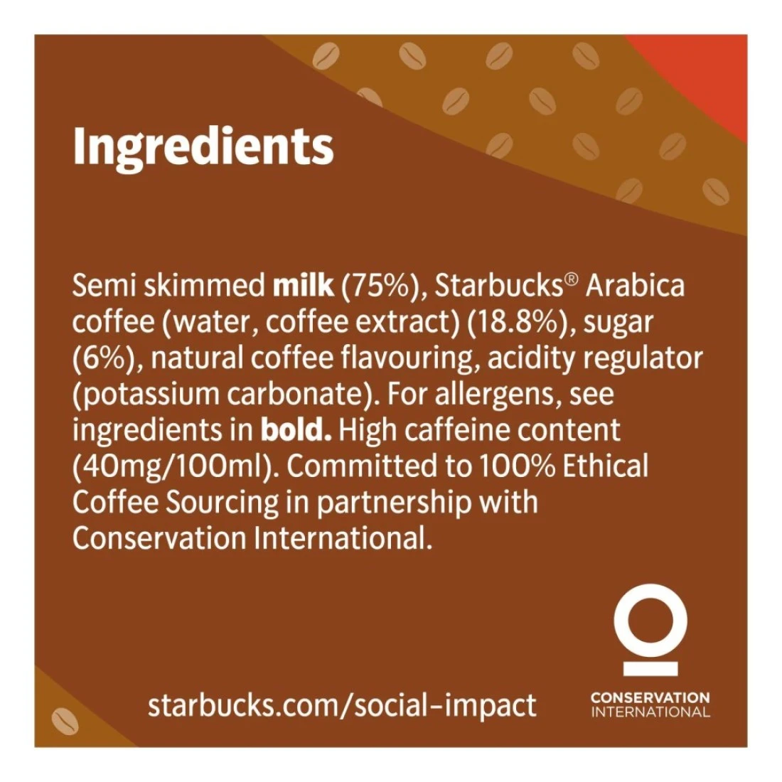 ingredients : 15% Fat Semi Skimmed Milk (75%), Coffee (water, Coffee Extract) (185%), Sugar (6%), Fat Reduced Cocoa Powder 02%, Natural Coffee Flavouring, Acidity Regulator (Potassium Carbonates)