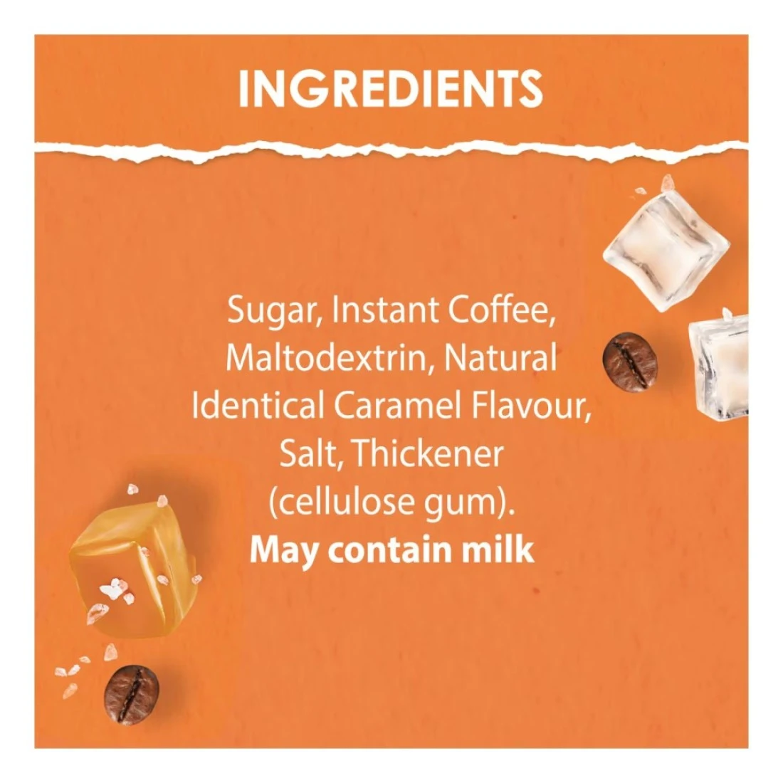 ingredients : Sugar, Instant Coffee, Maltodextrin, Natural Identical Caramel Flavour, Salt, Thickener (Cellulose Gum)