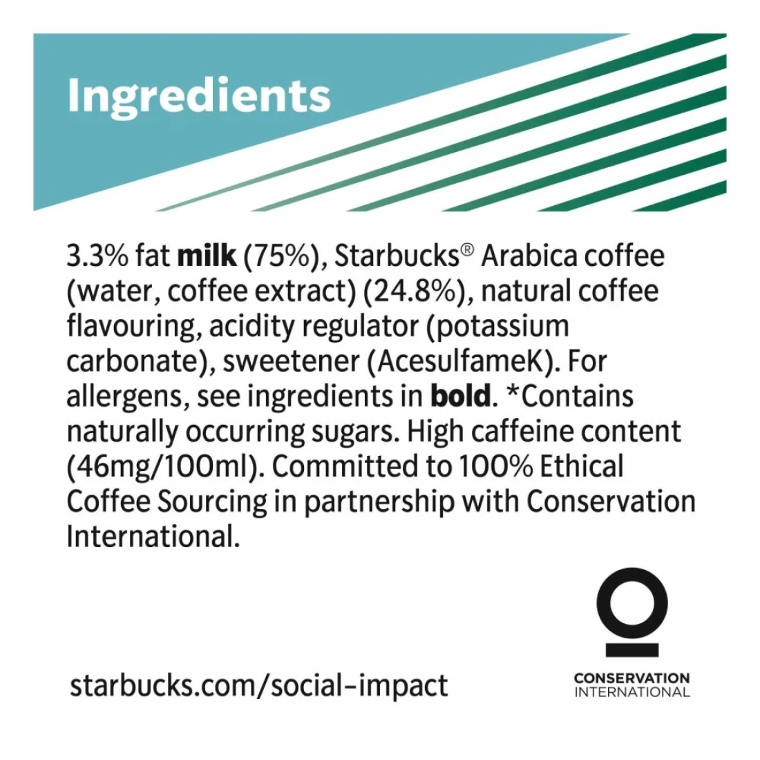 ingredients : 33% Fat Milk (75%), Starbucks Arabica Coffee (Water and Coffee Extract) (25%), Natural Coffee Flavouring, Acidity Regulator (Potassium Carbonate), Sweetener (AcessulfameK)
