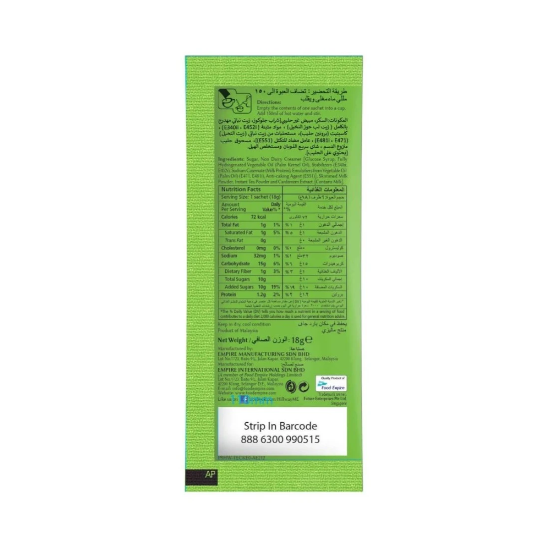 ingredients : Sugar, Non Dairy Creamer [Glucose Syrup, Hydrogenated Vegetable Oil (Palm Kernel Oil), Sodium Caseinate, Emulsifier From Vegetable Oil (Palm Oil) (E471, E481), Stabilizers (E340Ii, E452I), Anticaking Agent (E551], Skimmed Milk Powder, Instant Tea and Cardamom Extract