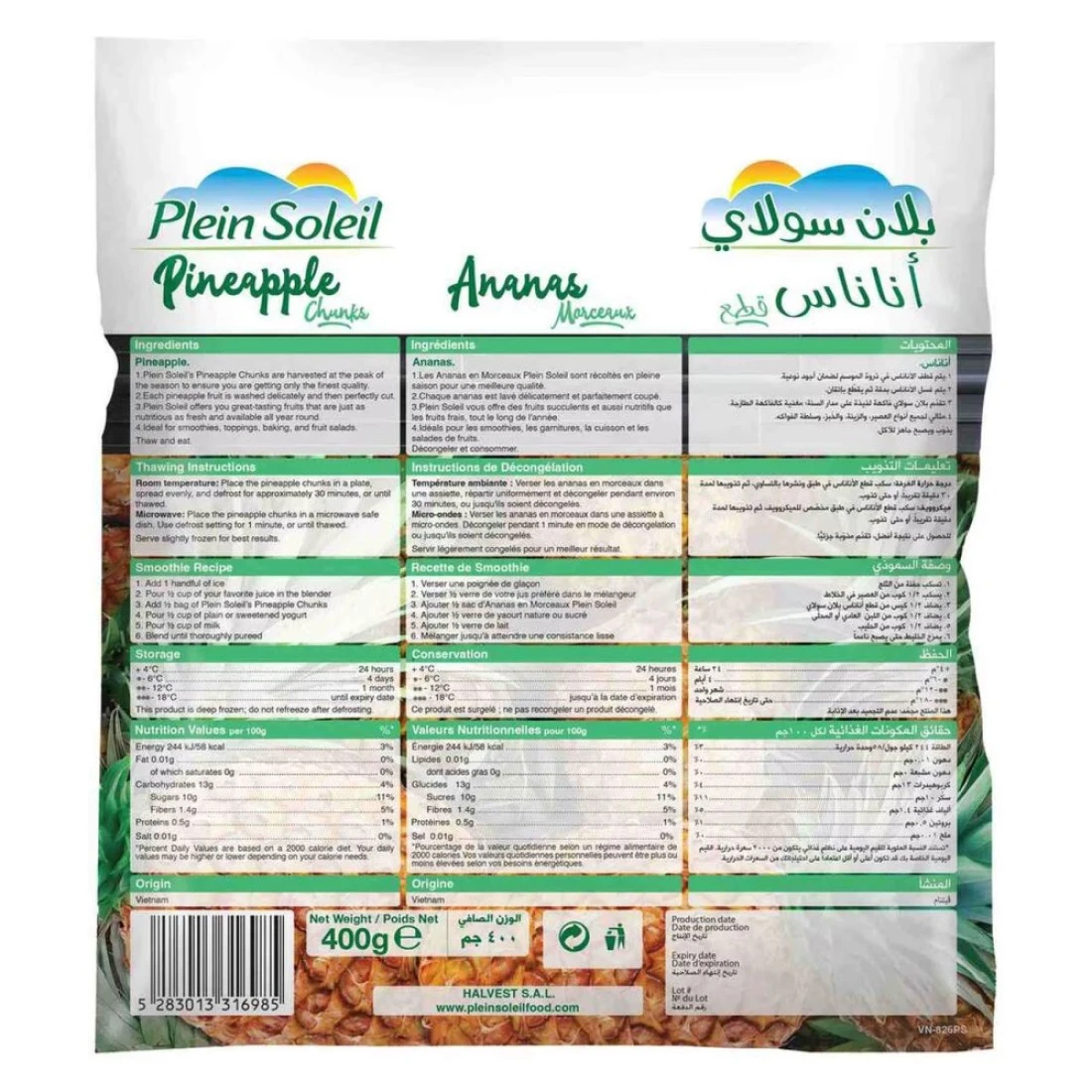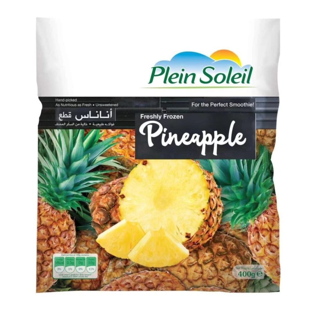 Plein Soleil Freshly Frozen Pineapple is a convenient and delicious option for enjoying the sweet and tangy flavour of pineapple. Each pack contains individual 400g portions of freshly frozen pineapple, perfect for adding to smoothies, desserts, or enjoying on its own.