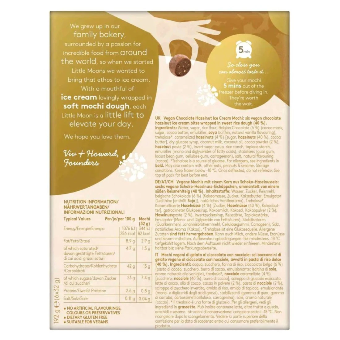 ingredients : Water, Sugar, Rice Flour, Belgian Chocolate (6%) (Cocoa Mass, Sugar, Cocoa Butter, Emulsifier: Soya Lecithin, Natural Vanilla Flavouring), Trehalose, Caramelised Hazelnuts (4%) [Sugar, Hazelnuts (40%), Cocoa Butter] Dry Glucose Syrup, Coconut Milk, Coconut Oil, Cocoa Powder (2%), Hazelnut Paste (2%), Invert Sugar Syrup, Rice Starch, Tapioca Starch, Emulsifier (Mono And Diglycerides Of Fatty Acids), Stabilisers (Guar Gum, Locust Bean Gum, Cellulose Gum, Carrageenan), Salt, Natural Flavouring (Cocoa).