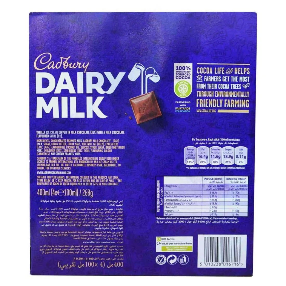 Cadbury Dairy Milk Creamy Vanilla Ice Cream Swirled With Smooth Milk Chocolate is a delicious treat that combines the creaminess of vanilla ice cream with the rich taste of milk chocolate. Each pack contains 4 individual 100ml servings, perfect for enjoying on a hot summer day or as a sweet indulgence after a meal. The creamy vanilla ice cream is made with real vanilla beans, giving it a natural and authentic flavour. The smooth milk chocolate swirls add a decadent touch, making each bite a delightful combination of flavours and textures. Whether you're a fan of ice cream or chocolate, this Cadbury Dairy Milk treat is sure to satisfy your cravings. With its convenient pack of 4, you can easily share this delicious dessert with family and friends. The individual servings are also great for portion control, allowing you to enjoy a satisfying treat without overindulging. Treat yourself to the creamy goodness of Cadbury Dairy Milk Creamy Vanilla Ice Cream Swirled With Smooth Milk Chocolate today!