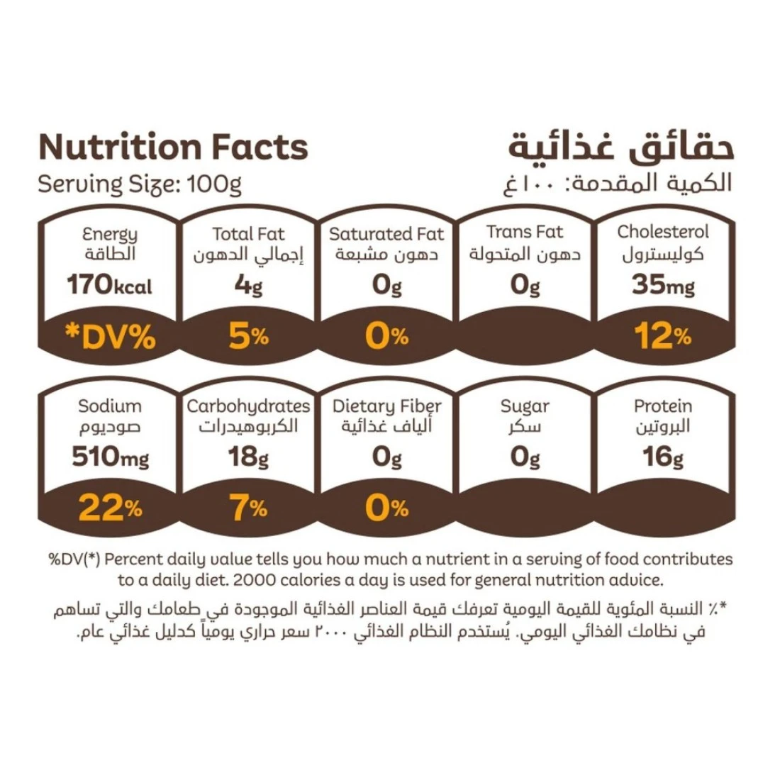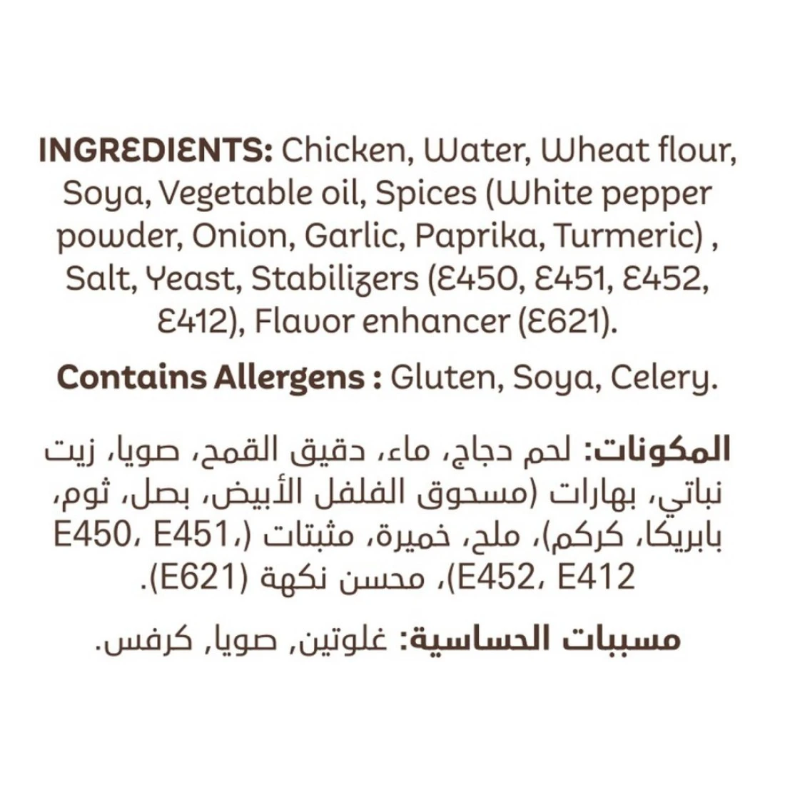 ingredients : Chicken, Water, Wheat Flour, Soya, Vegetable Oil, Spices (White pepper powder, Onion, Garlic, Paprika, Turmeric), Salt, Yeast, Stabilizers (E450, E451, E452, E412), Flavour enhancer(E621)