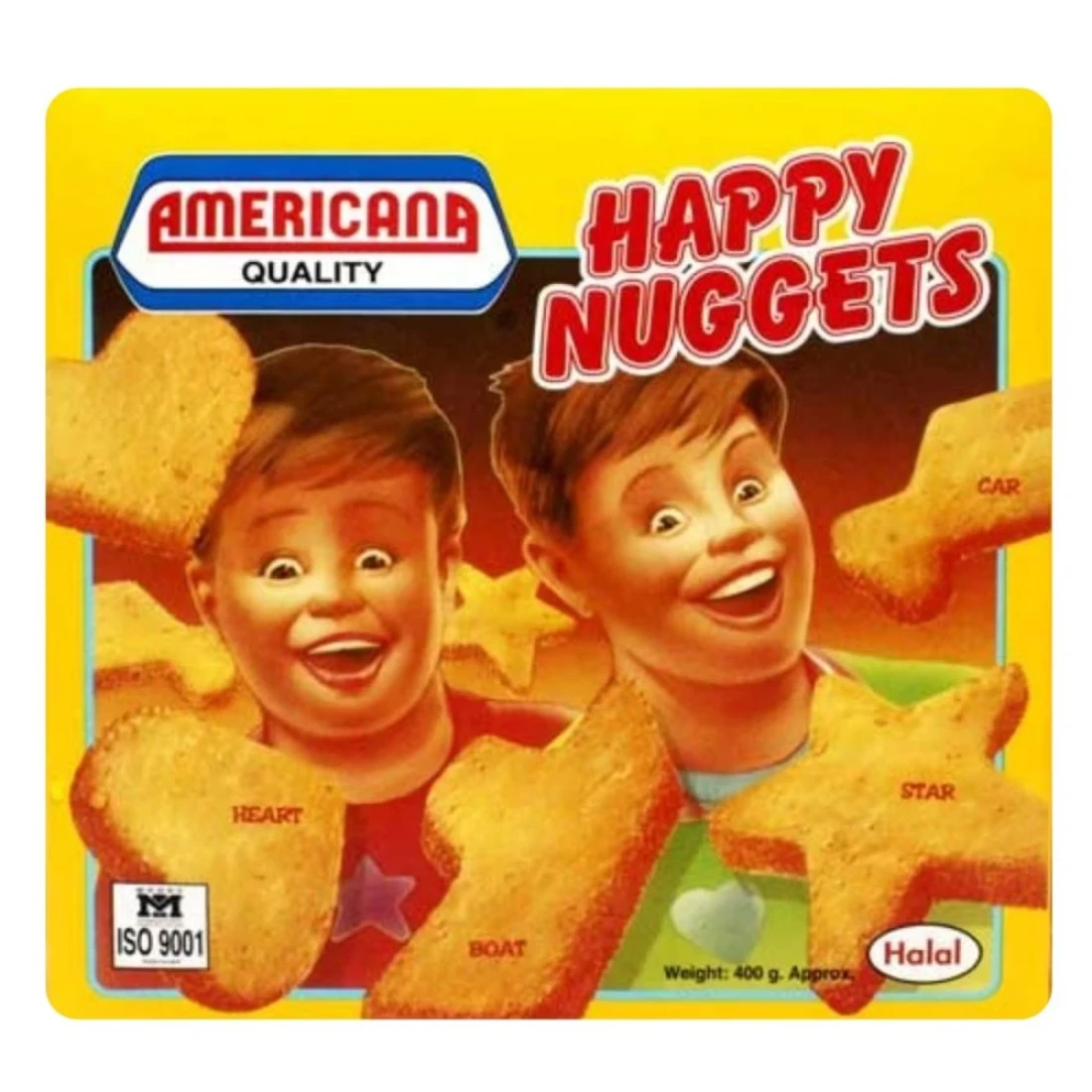 Americana Happy Nuggets are a delicious and convenient snack option for both kids and adults. These crispy nuggets are made from high-quality chicken meat and are perfectly seasoned to provide a burst of flavour with every bite. Whether you're hosting a party or looking for a quick and easy meal, these nuggets are sure to be a hit. This pack of 2 contains 400g of Americana Happy Nuggets, giving you plenty to enjoy. The nuggets are easy to prepare - simply pop them in the oven or fry them until golden and crispy. Serve them with your favorite dipping sauce or alongside some fries for a complete meal. With their tender texture and savoury taste, these nuggets are a crowd-pleasing option for any occasion. With Americana Happy Nuggets, you can enjoy the taste of your favorite fast-food chicken nuggets from the comfort of your own home. These nuggets are made with real chicken meat and are free from artificial colours and flavours. Each bite is packed with protein and flavour, making them a healthier alternative to traditional fast-food options. Grab a pack of 2 today and satisfy your cravings for crispy, delicious chicken nuggets.