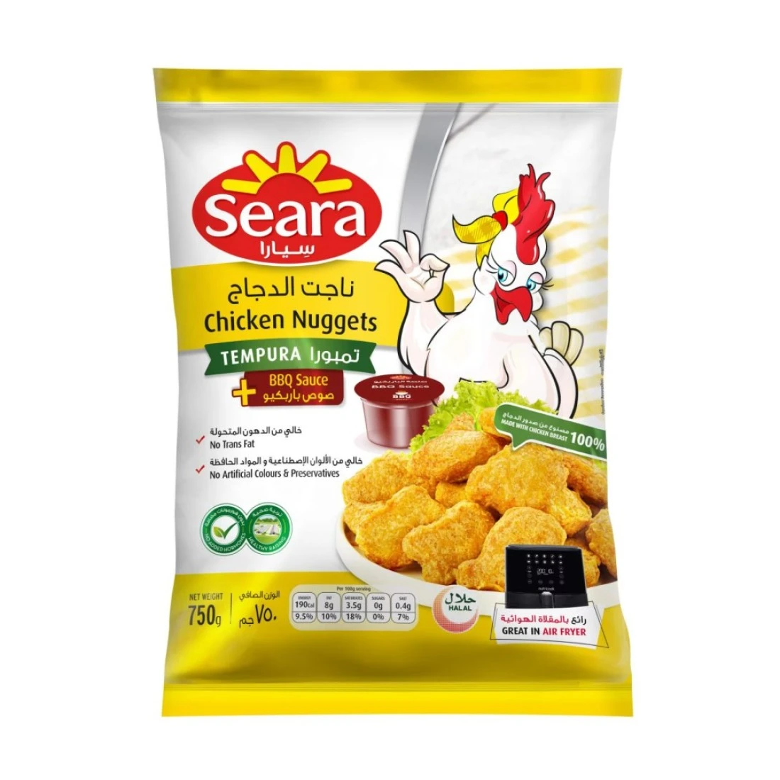 Seara Tempura Chicken Nuggets are a delicious and convenient option for a quick and easy meal. These crispy and tender chicken nuggets are made with high-quality chicken breast meat and coated in a light and crispy tempura batter. They are perfect for kids and adults alike and can be enjoyed as a snack, appetizer, or main course. With a generous 750g pack, Seara Tempura Chicken Nuggets are great for feeding a crowd or stocking up for future meals. They can be easily prepared in the oven, air fryer, or deep fryer, and are ready to serve in just minutes. Whether you're hosting a party, looking for a quick dinner solution, or simply craving a tasty snack, Seara Tempura Chicken Nuggets are a versatile and delicious choice. When it comes to quality and taste, Seara is a trusted brand that delivers. Their Tempura Chicken Nuggets are made with 100% natural ingredients, without any artificial preservatives or flavours. Each bite is packed with juicy chicken and a crispy coating that will satisfy your cravings. So why wait? Try Seara Tempura Chicken Nuggets today and discover a new favorite for your family!